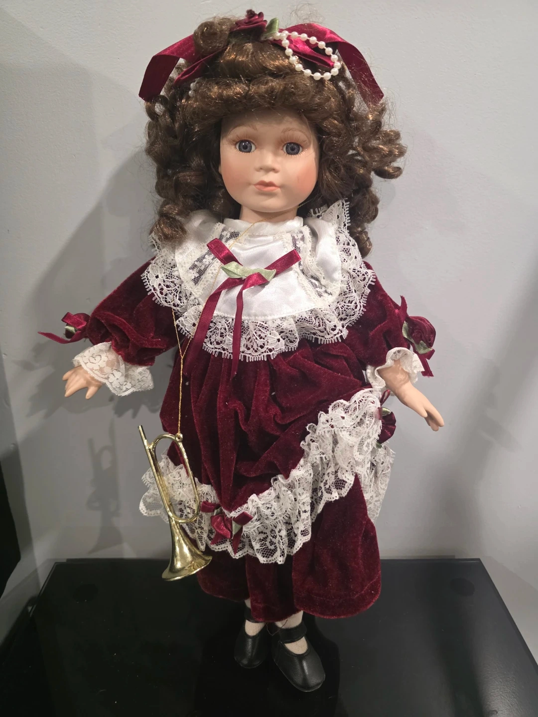 This is a beautiful porcelain doll dressed in a burgundy velvet dress with white lace trim. She has curly brown hair and is holding a small golden trumpet. A lovely addition to any doll collection!