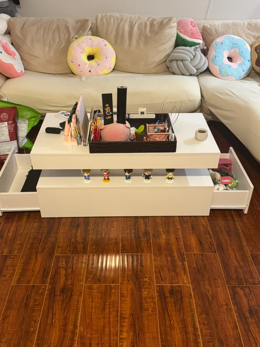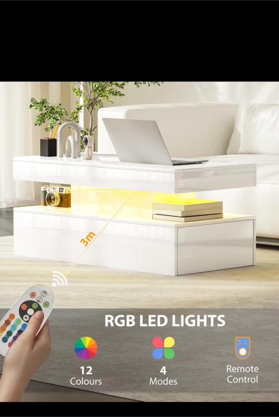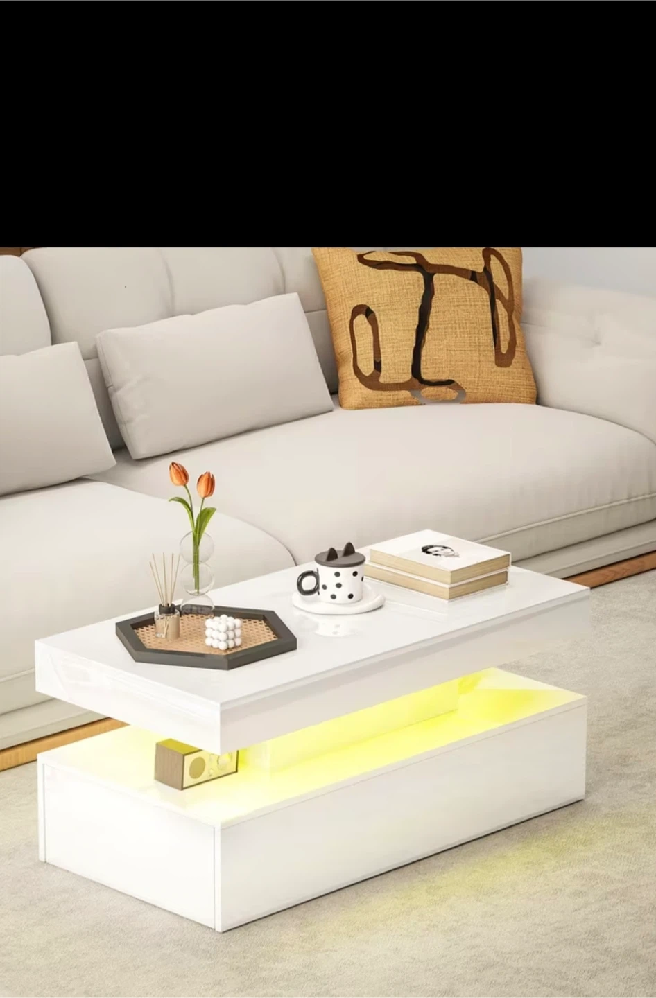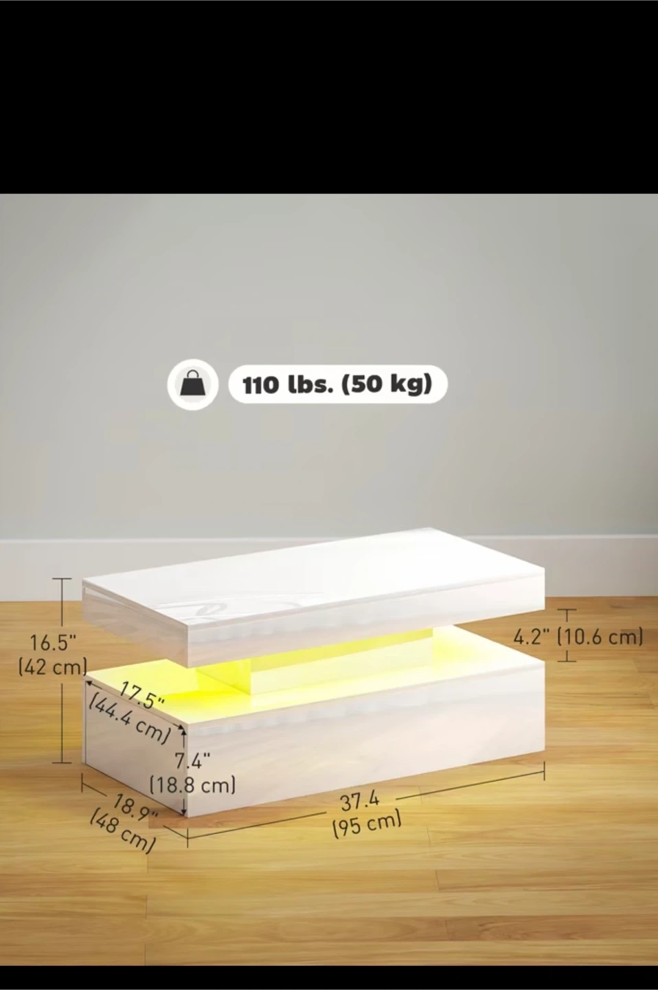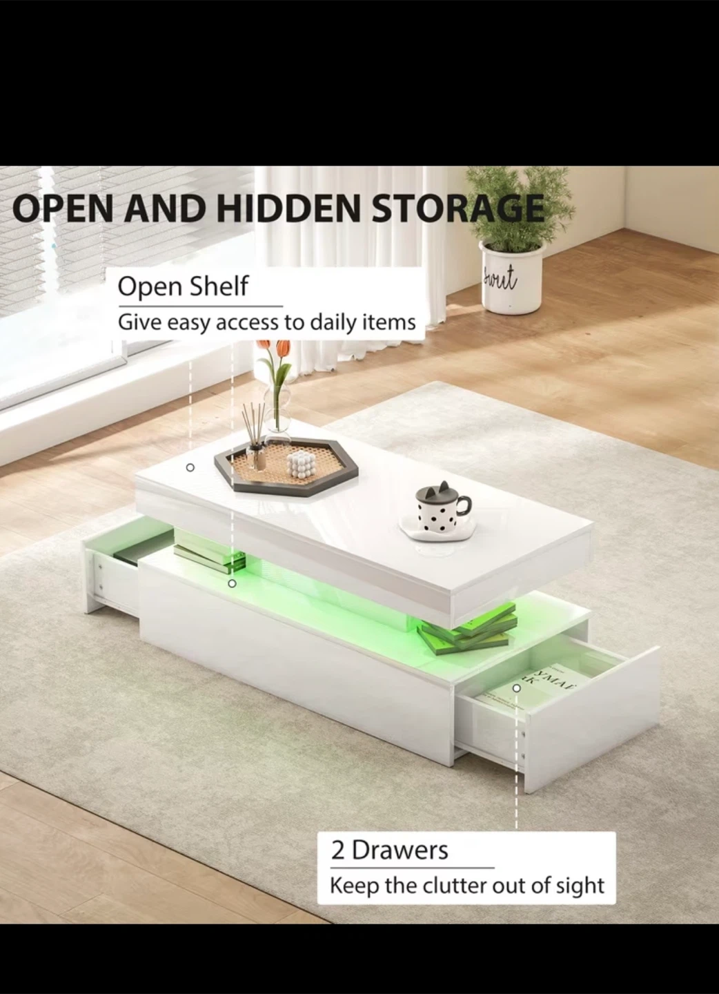 This modern coffee table features a high gloss design with RGB LED lights and a remote control. It has both open shelves and two drawers to keep your living room tidy. The table is white and measures approximately 37.4" x 18.9" x 16.5". It offers open and hidden storage for easy access to daily items and keeps clutter out of sight