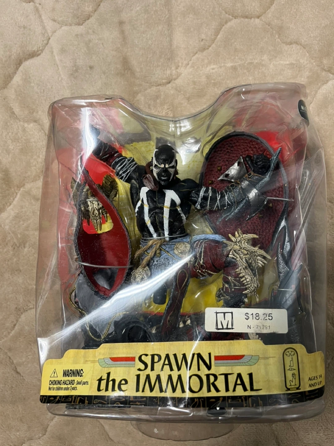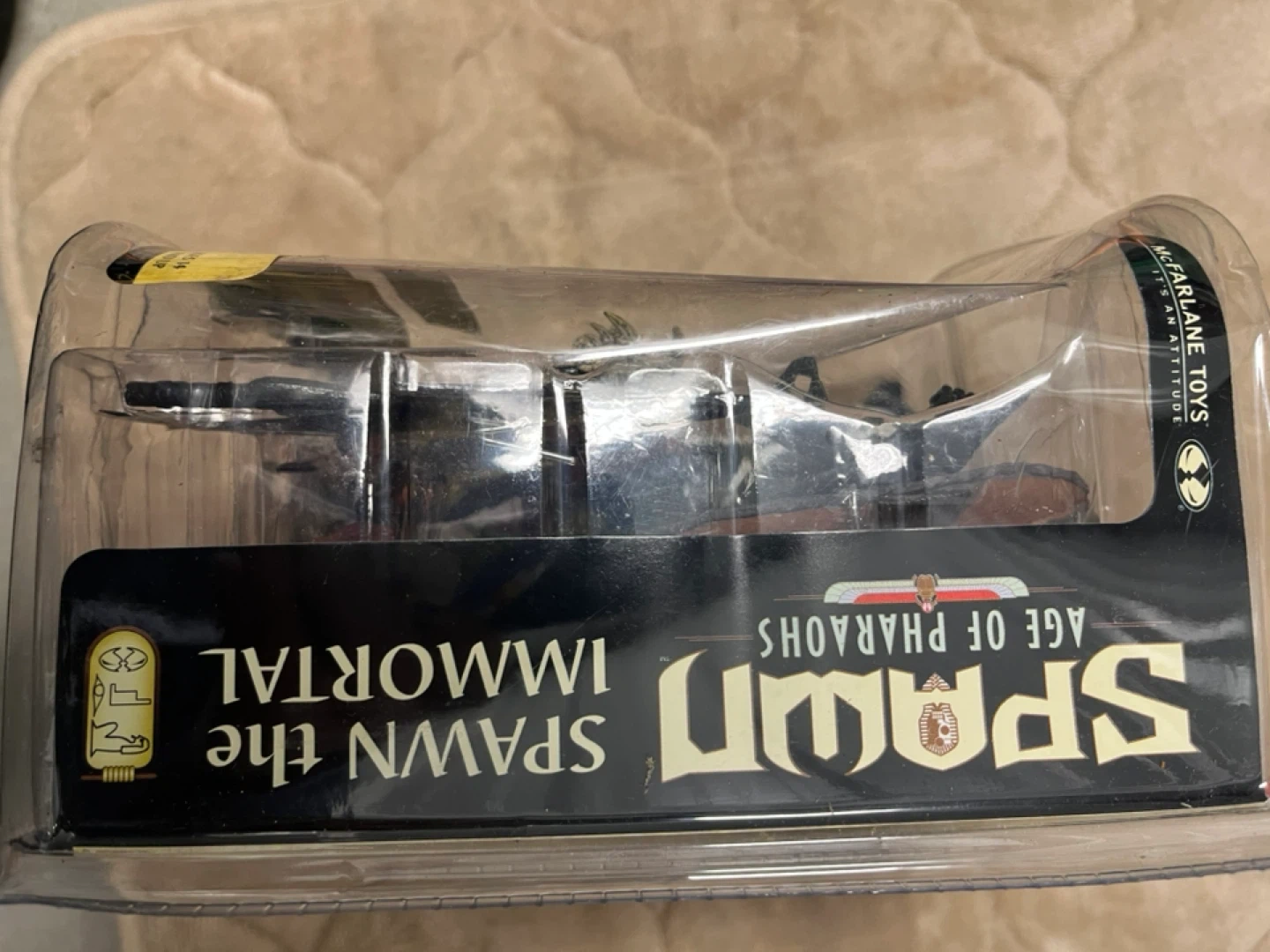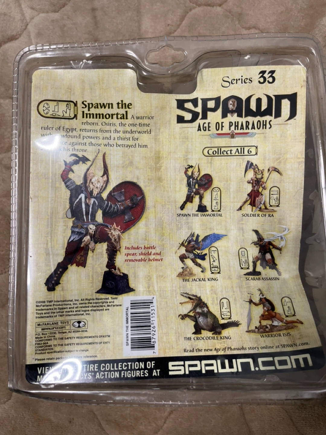 Selling a Spawn the Immortal action figure, still in its original packaging! This is from the Age of Pharaohs series, specifically Series 33. It includes a battle spear, shield, and removable helmet. A great collectible for any Spawn fan