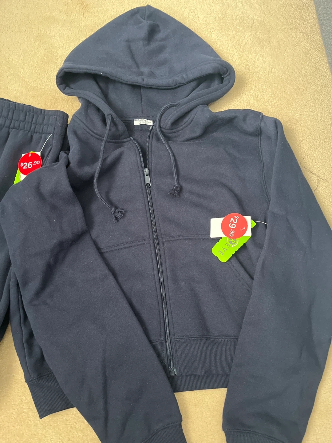 Selling a brand new Ardene tracksuit in a lovely navy blue colour! The set includes a zip-up hoodie (size M) and comfy sweatpants (size L). Both pieces still have their original tags attached. Originally bought for $29.90 (hoodie) and $26.90 (pants). Both are the same colour concord blue.