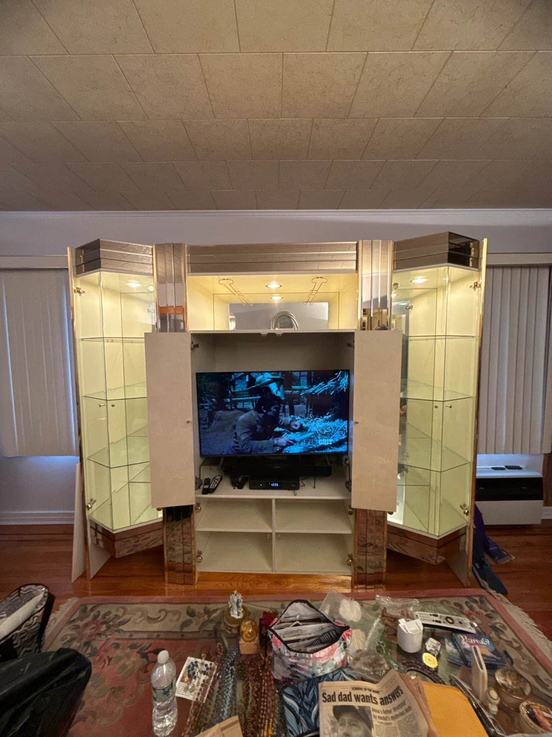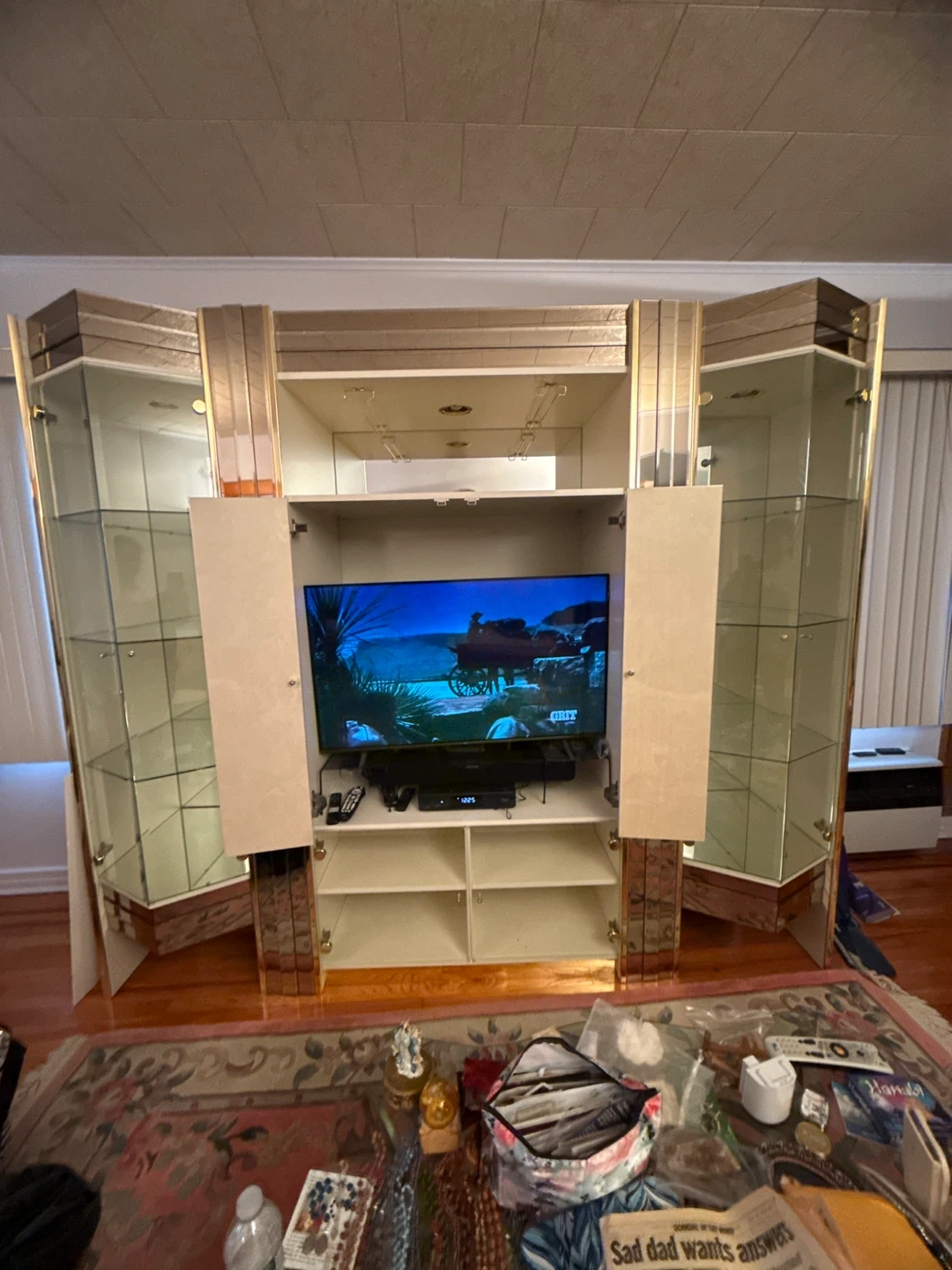 Selling a large entertainment center with glass display cabinets on either side. It has a built-in space for a TV and shelving for storage. Perfect for a living room or entertainment area! has lights on all 3 pieces