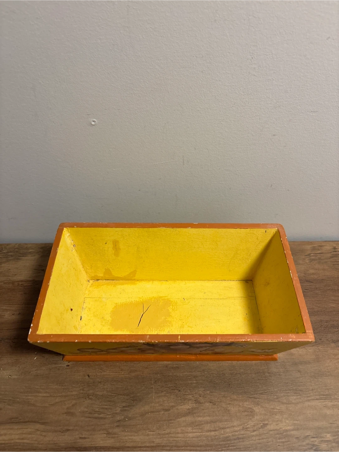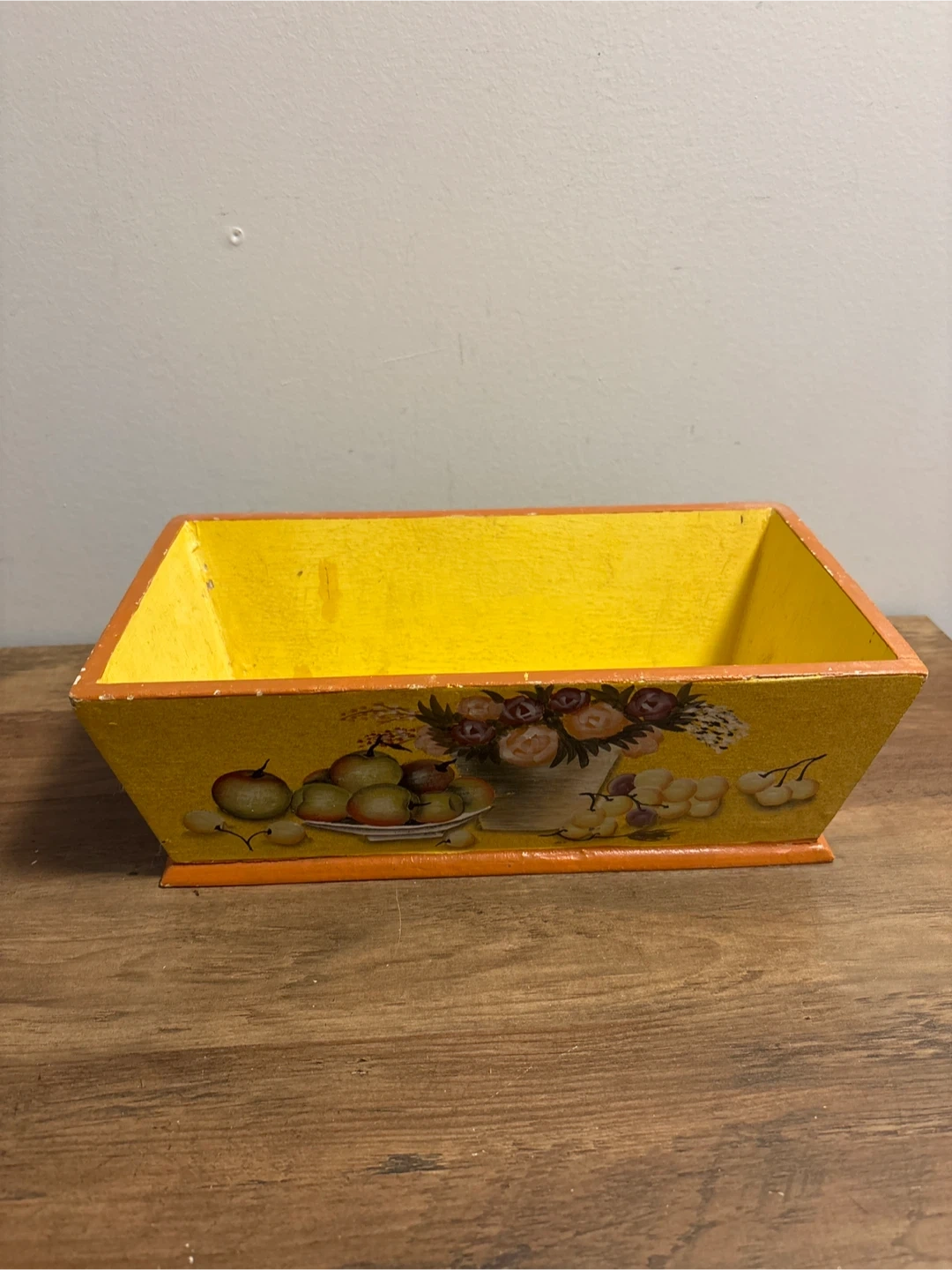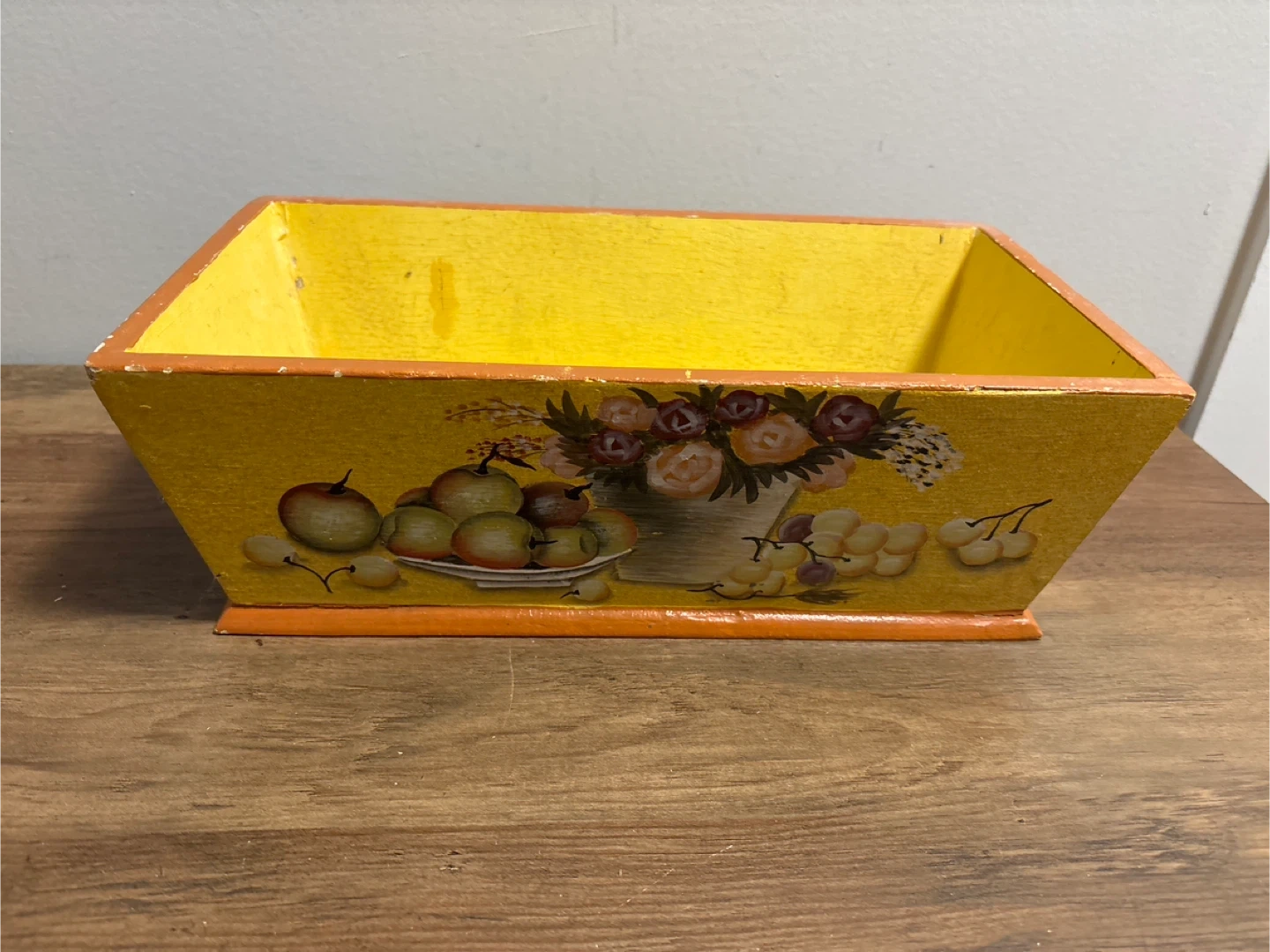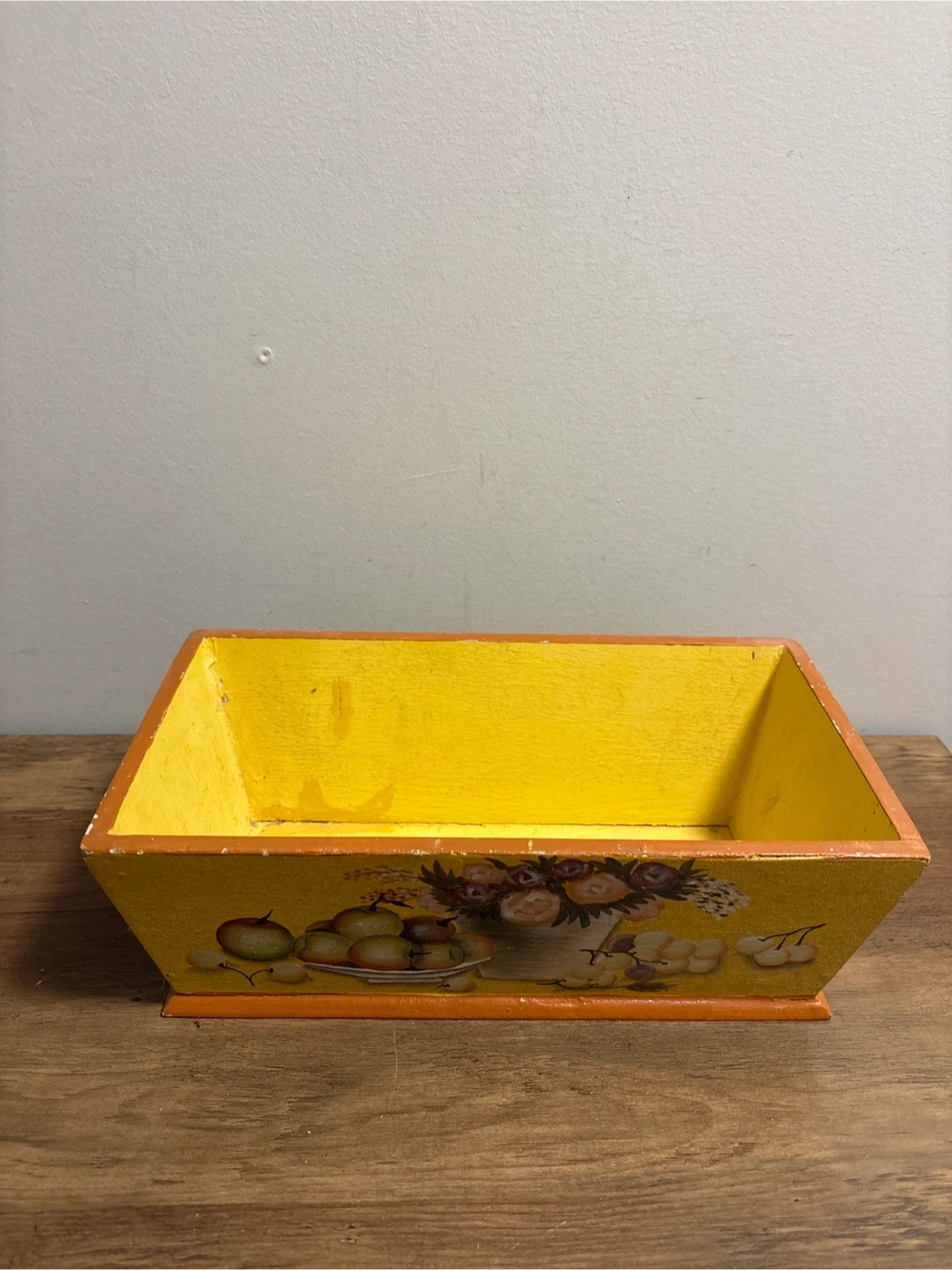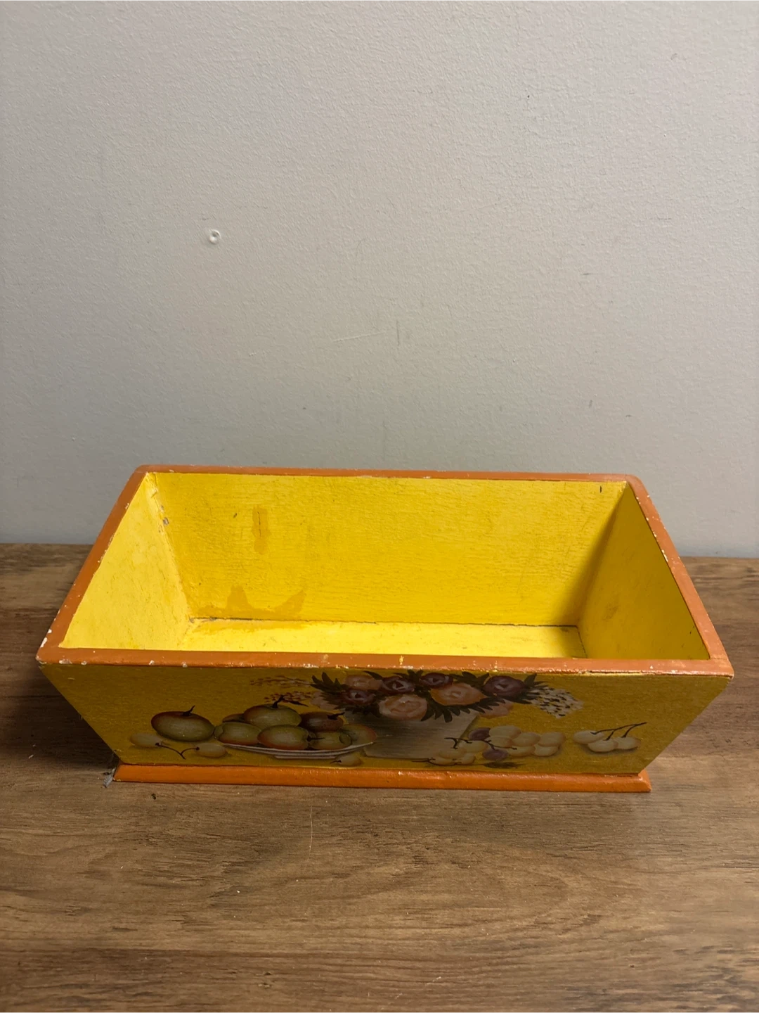Here's a cute vintage wooden box, perfect for adding a touch of charm to any room! It's painted yellow with a sweet fruit and flower design. It would look lovely as a decorative piece or for storing small items