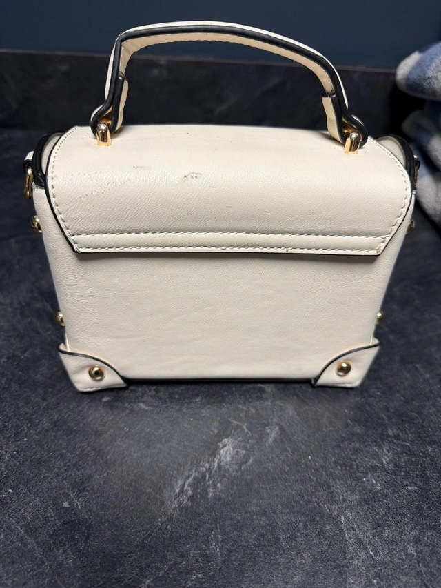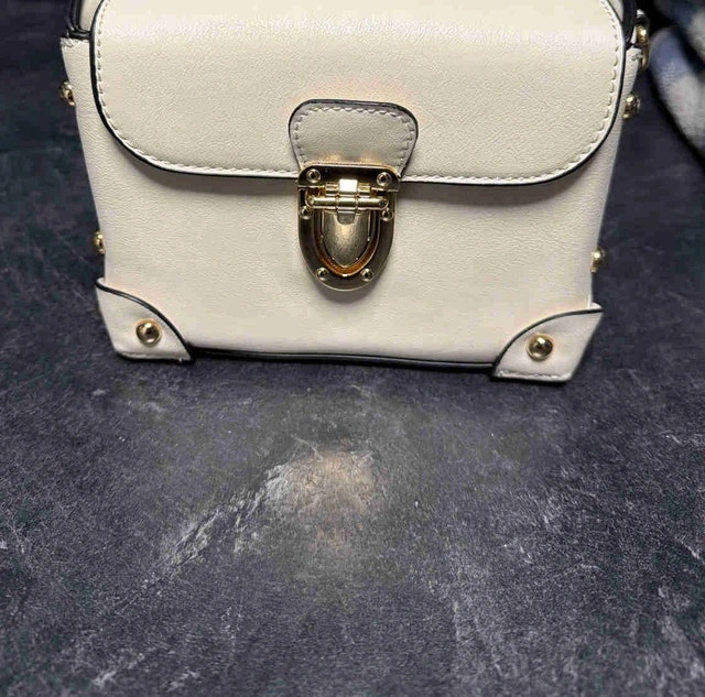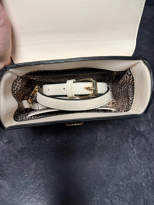 Small scuffs on the flap from storage but never used. This chic, cream-coloured purse features a structured, boxy design with gold-tone hardware accents and a turn-lock closure, perfect for adding a touch of elegance to any outfit. Features: - Colour: Cream - Hardware: Gold-tone - Closure: Turn-lock - Interior: Lined with leopard print fabric - Includes: Optional shoulder strap. Cash accepted.