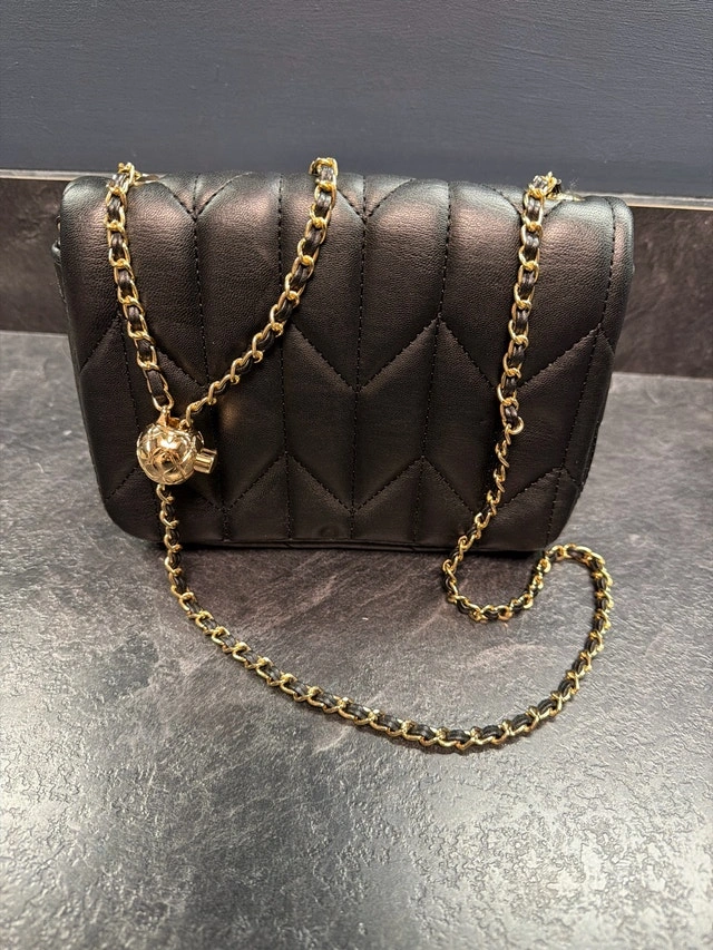 This is a black quilted bag with gold hardware and a unique spherical detail on the chain. The interior features a fun leopard print lining, adding a touch of whimsy to the classic design. Never Used.