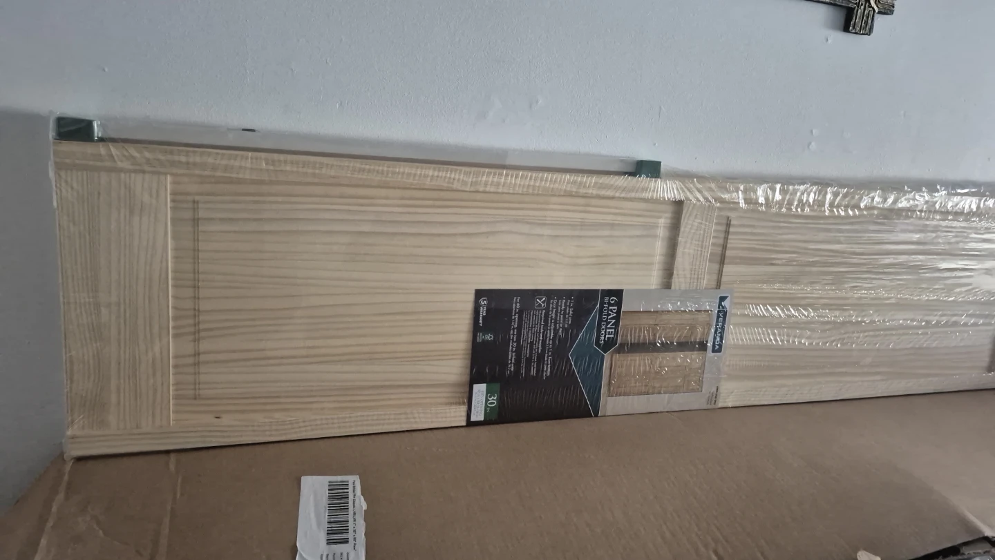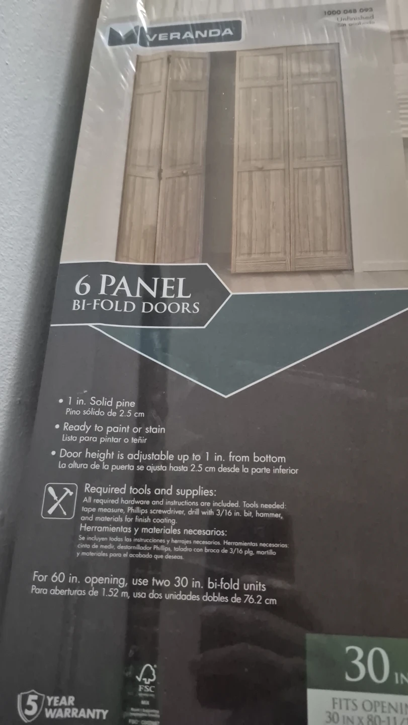 Selling a new Veranda 6 Panel Bi-Fold Door. It's 30W × 80H and made of solid pine. Ready to paint or stain to match your space. Door height is adjustable up to 1 inch from the bottom