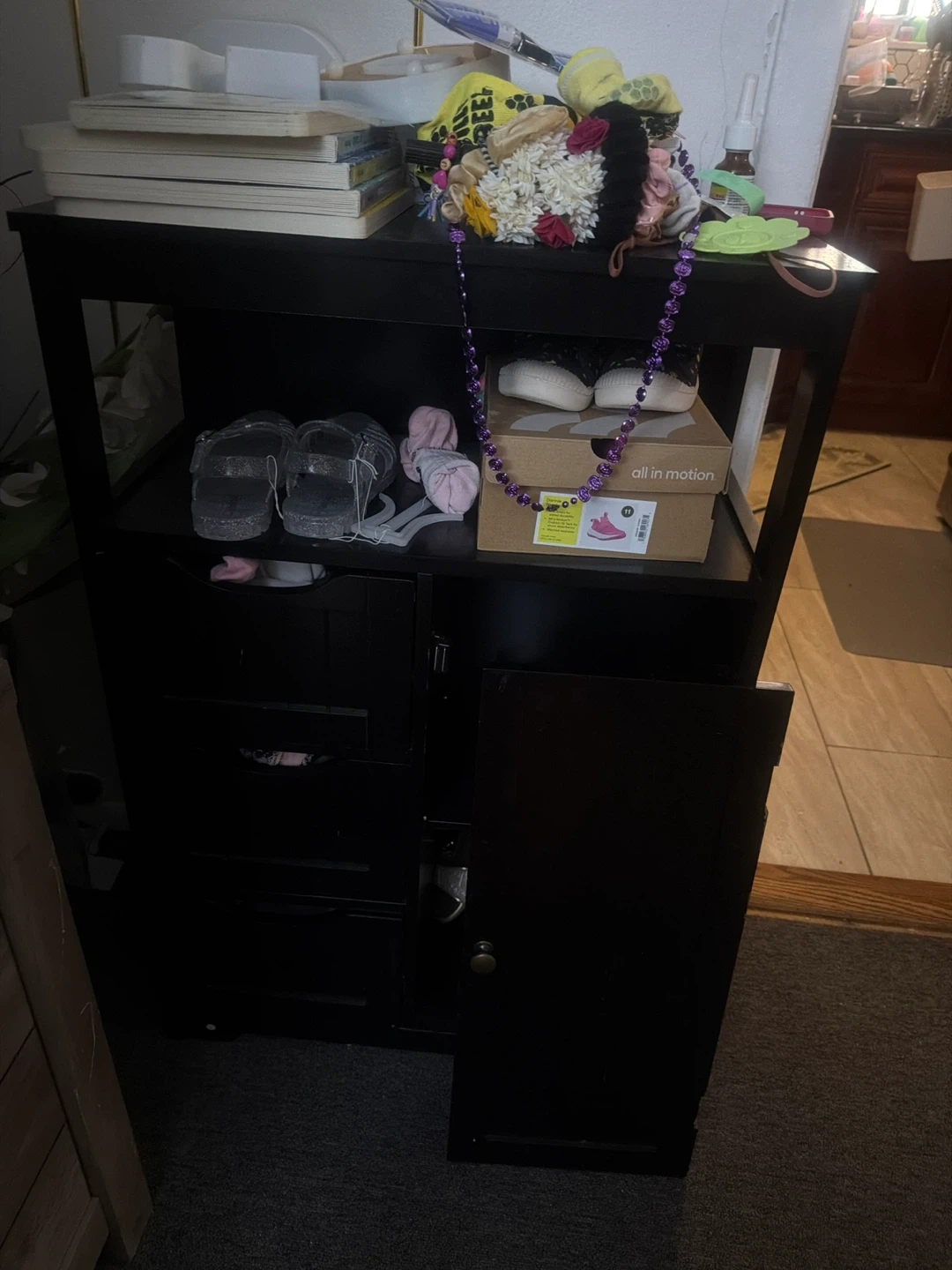 Selling a black storage cabinet. It has a drawer and a cabinet space. Good for storing various items!
