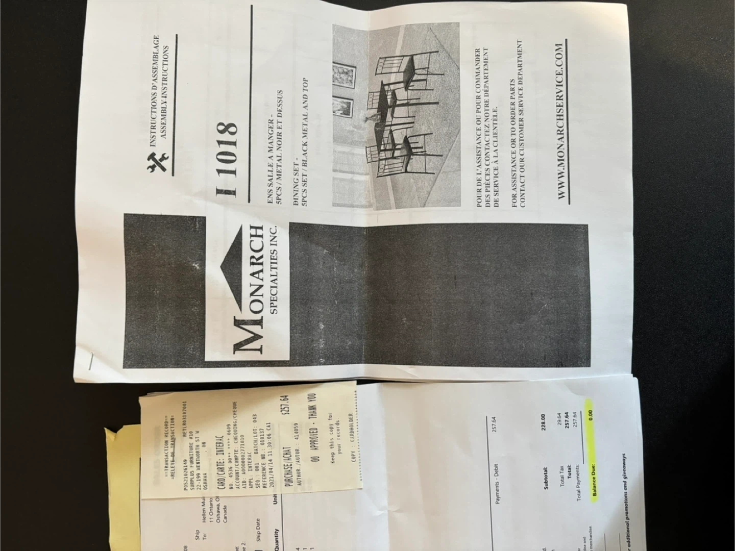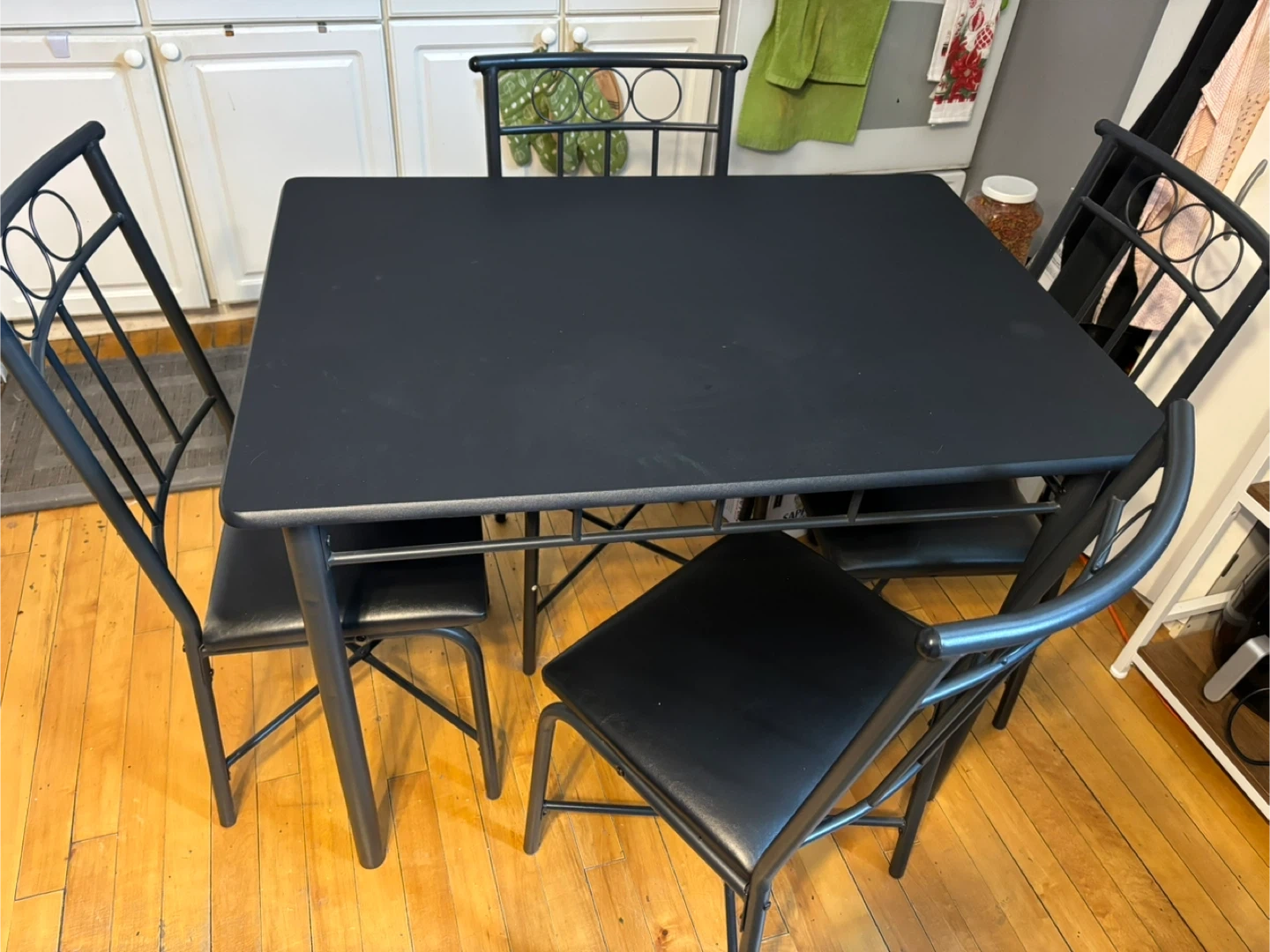 Selling a Monarch Specialties 5-piece dining set! This set includes a table and four chairs, all in black metal. It's a great set for smaller spaces. Originally bought for $257.64. The assembly instructions are also included!