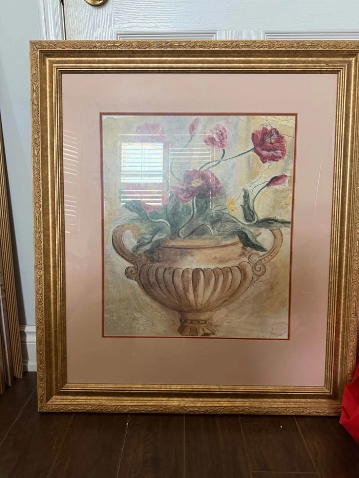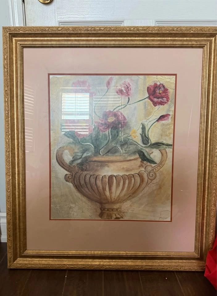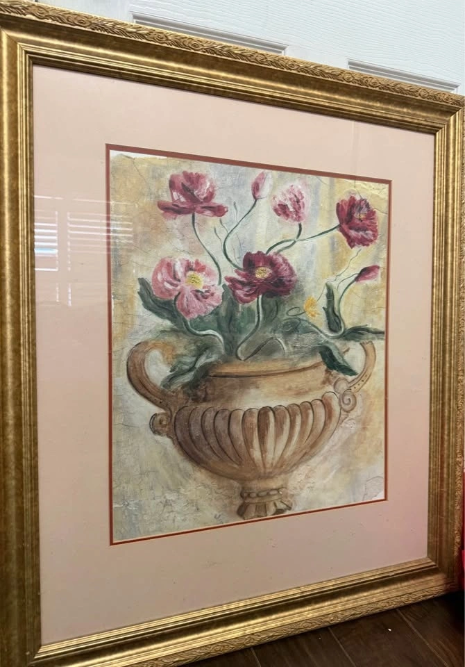 Classic still life featuring vibrant red and pink poppies in a traditional fluted urn. Traditional / French Country / Shabby Chic / Mediterranean style. Solid, ornate gold-finished frame with a detailed scroll pattern. Excellent vintage condition. The frame is sturdy with minimal wear, and the art is protected behind glass. Professionally finished back with a sawtooth hanger; ready to display immediately. Perfect as a statement piece for a dining room, entryway, or bedroom. Outer Frame: [e.g., 28" x 34"]. Inner Art (visible): [e.g., 20" x 24"].