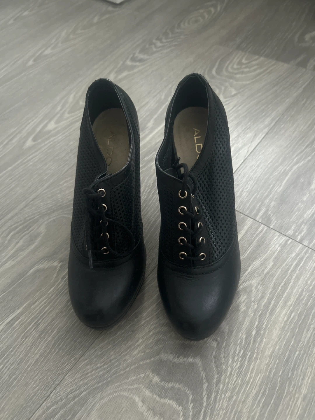 Selling a pair of Aldo heeled booties in black. They are a size 8 and have a lace-up front. There are some signs of wear on the soles, but they're still in good condition for daily wear!