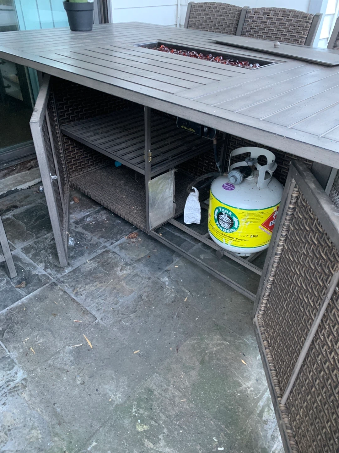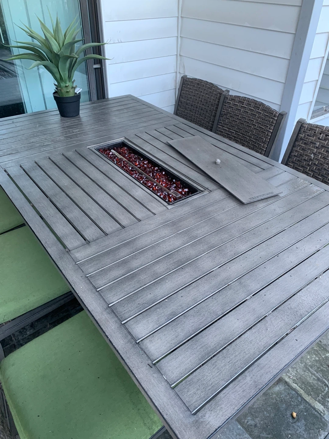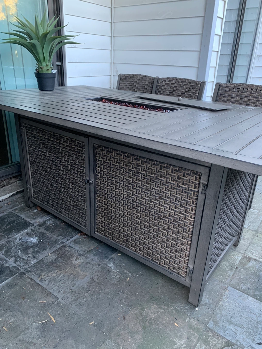 Selling an outdoor dining table that features a built-in fire pit in the center. It comes with red fire glass and a cover for the fire pit when not in use. The table has a cabinet base, perfect for storing a propane tank or other outdoor essentials. Chairs are also included!