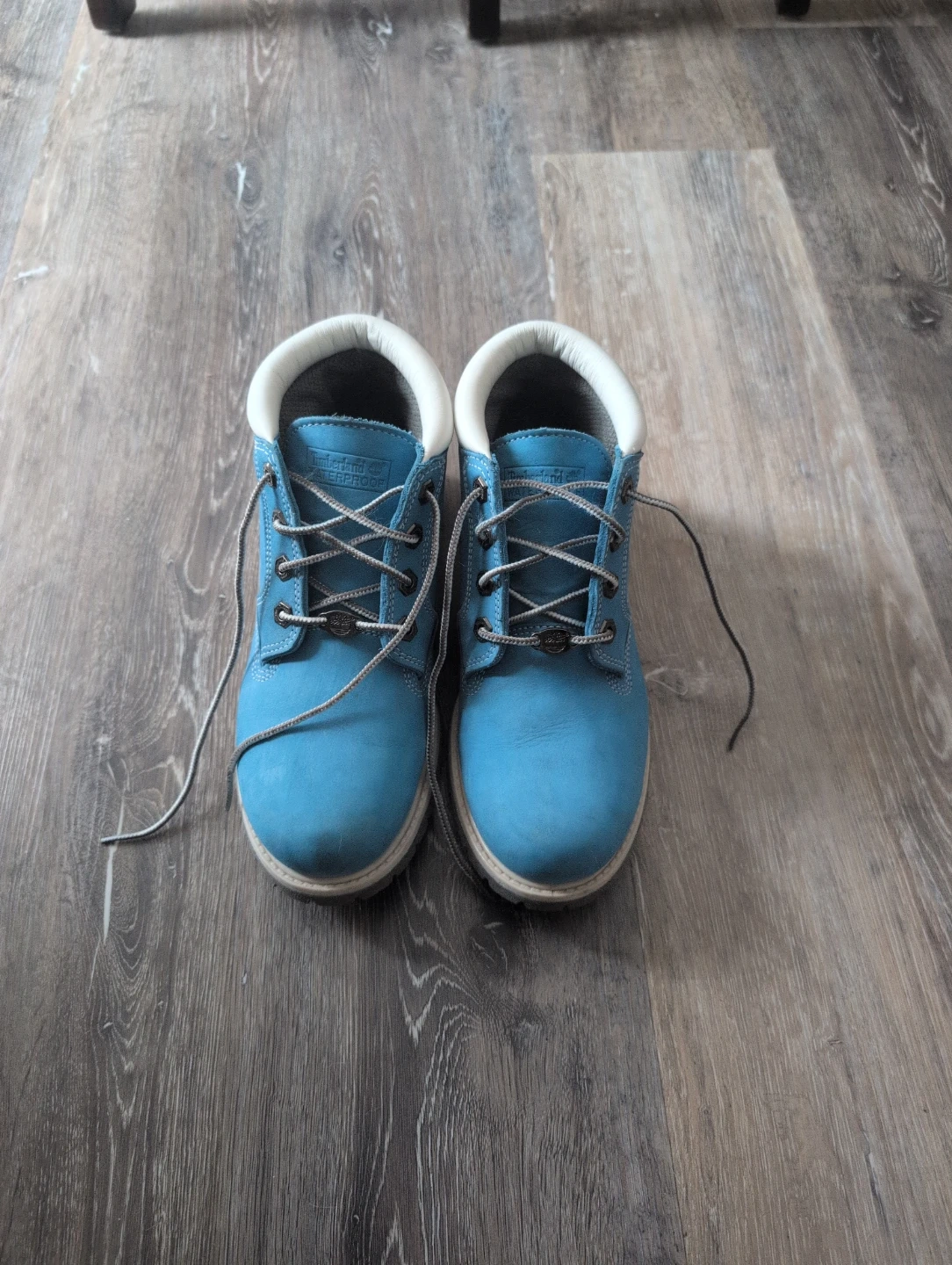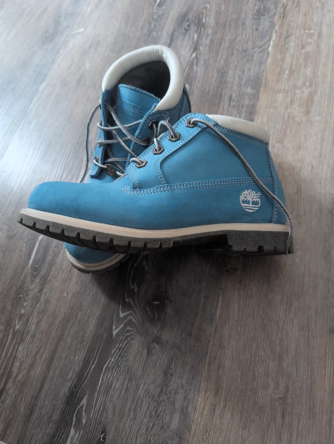 These Timberland chukka boots are a vibrant blue colour and made of leather! They're in good condition and ready for a new home. The classic Timberland style is always a great choice