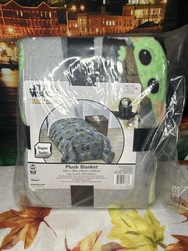 Snuggle up with your favorite Star Wars character and stay warm with this super soft plush blanket. Featuring The Child, also known as Baby Yoda or Grogu, from The Mandalorian series, this rectangular blanket is perfect for travel or use in your bedroom. Made of polyester material, it is machine washable and features an all-over pattern of The Child character. This Disney brand blanket is suitable for all ages, including teens, adults, and kids. Let me know if you're interested!