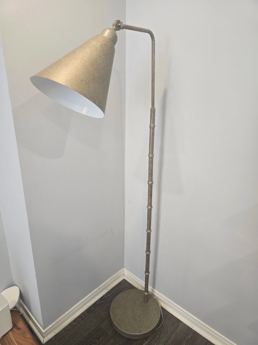 Selling a gold-coloured floor lamp. It has a cone-shaped shade and a bamboo-style stand. It's in great condition and would look great in any room