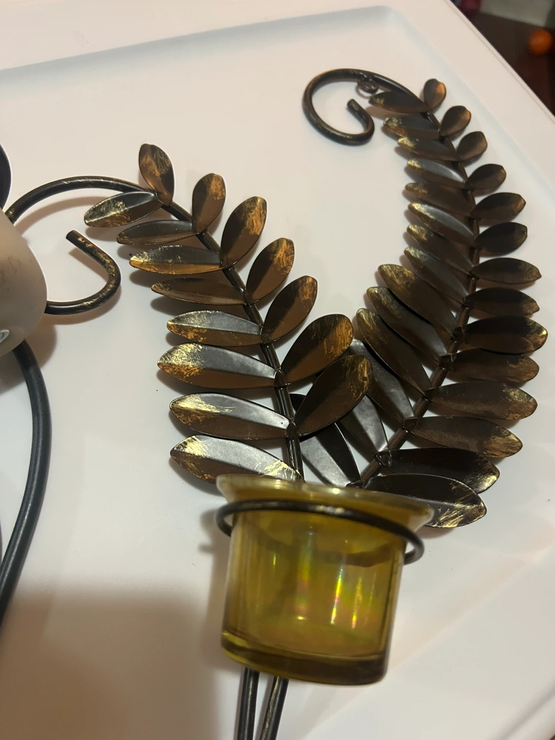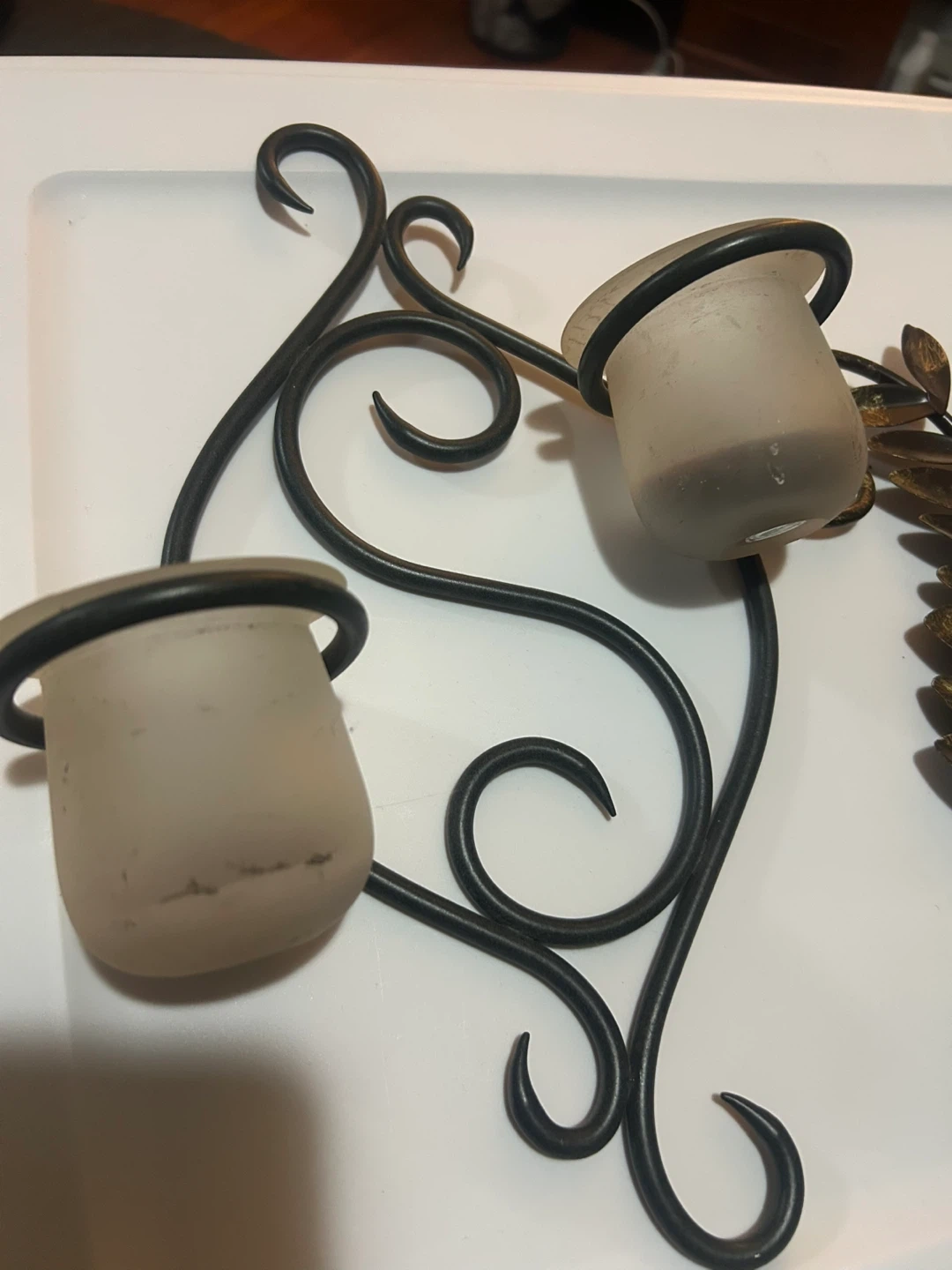 Selling a unique metal wall candle holder with glass cups for tea lights or small candles. It has a decorative metal leaf design and a sturdy black metal frame. A charming addition to any room!