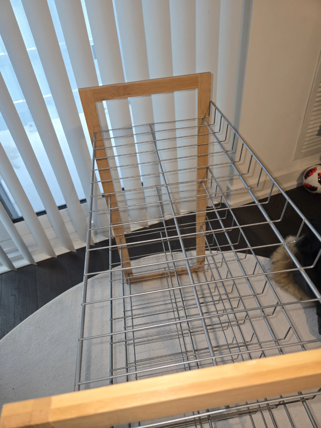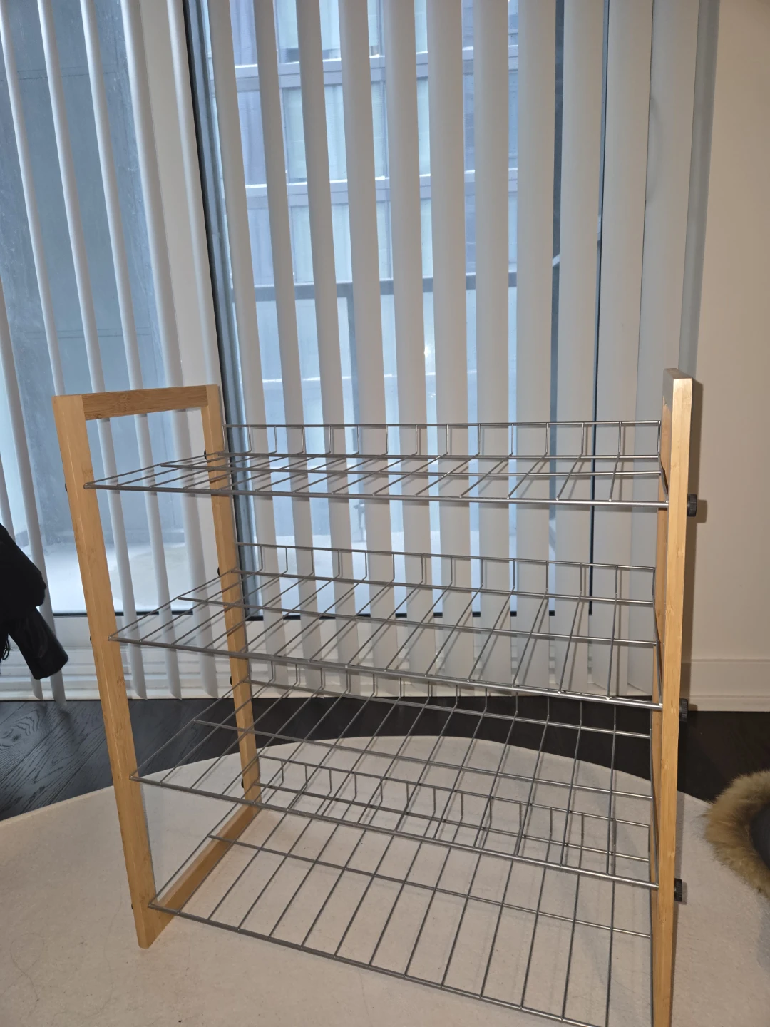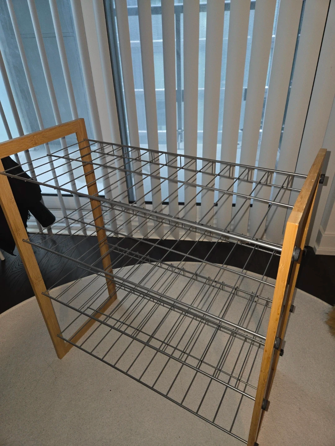 Selling a shoe rack with a wooden frame and metal shelves. It's in great condition and ready to organize your footwear!