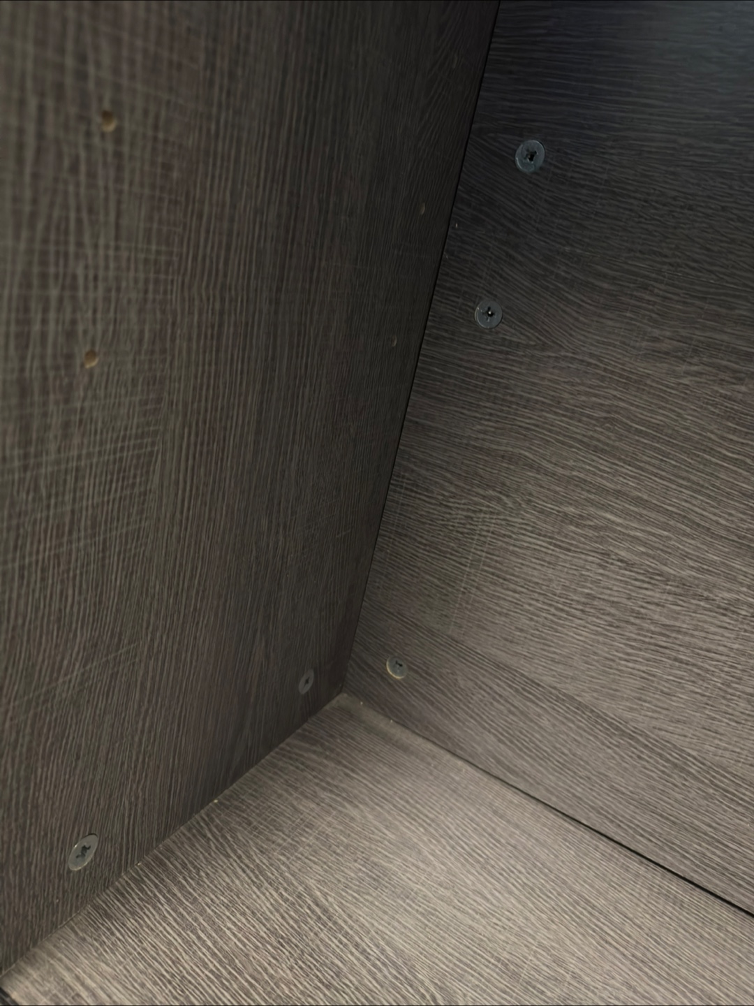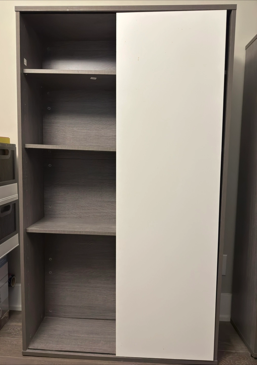 Original from Costco. with a sliding door, perfect for extra storage or as a Bookshelf. It's in great shape and has a nice grey and white finish
