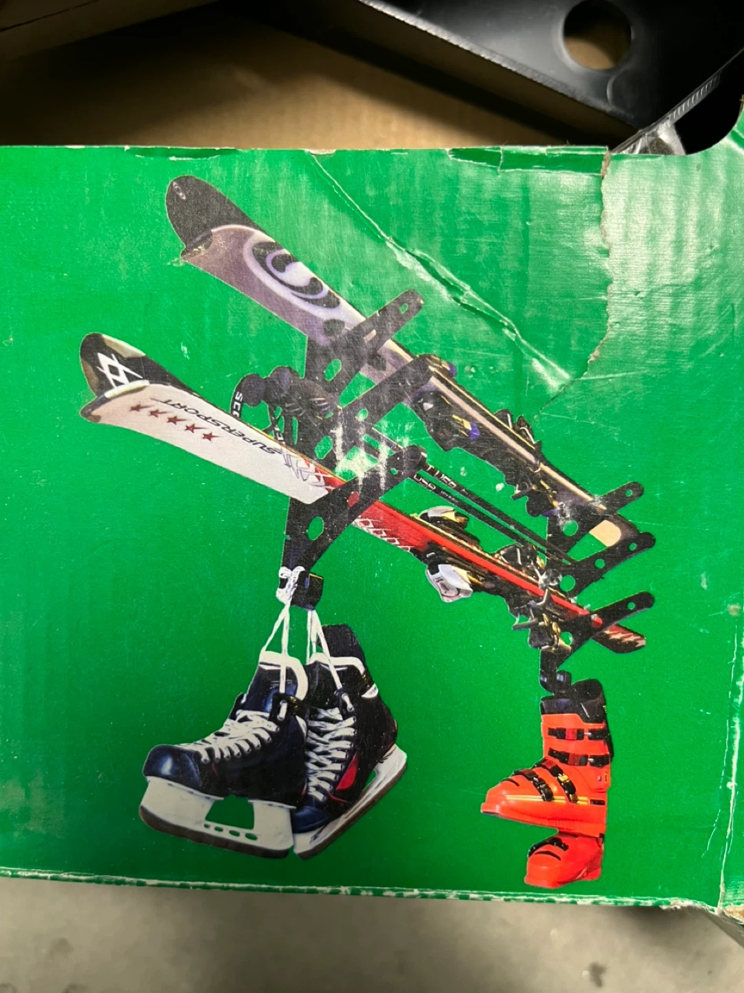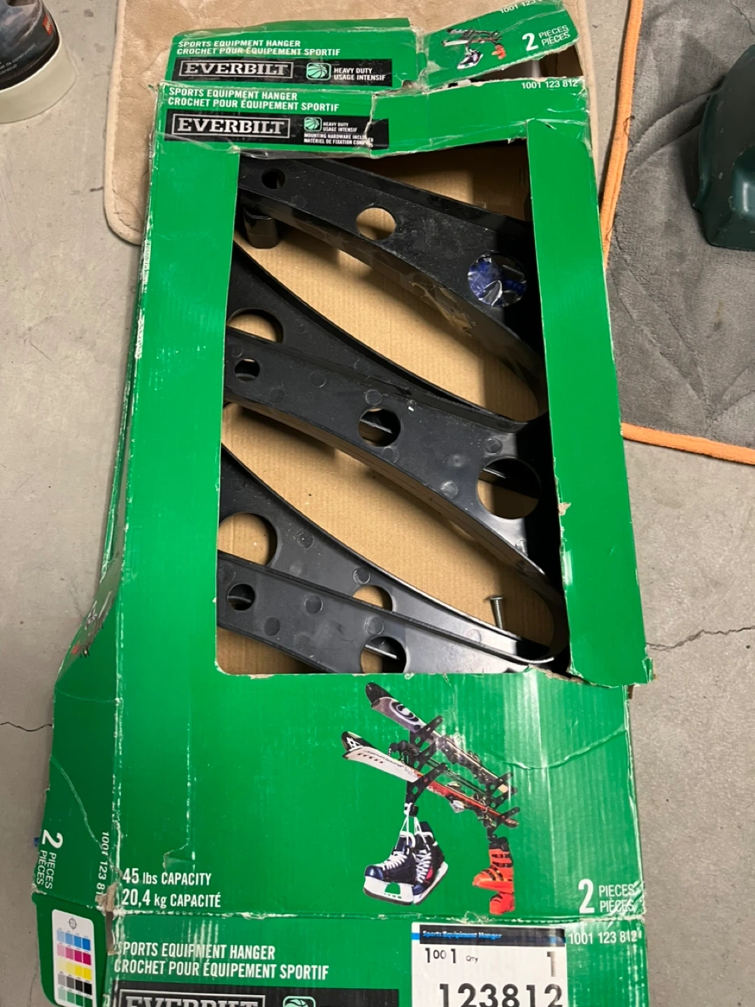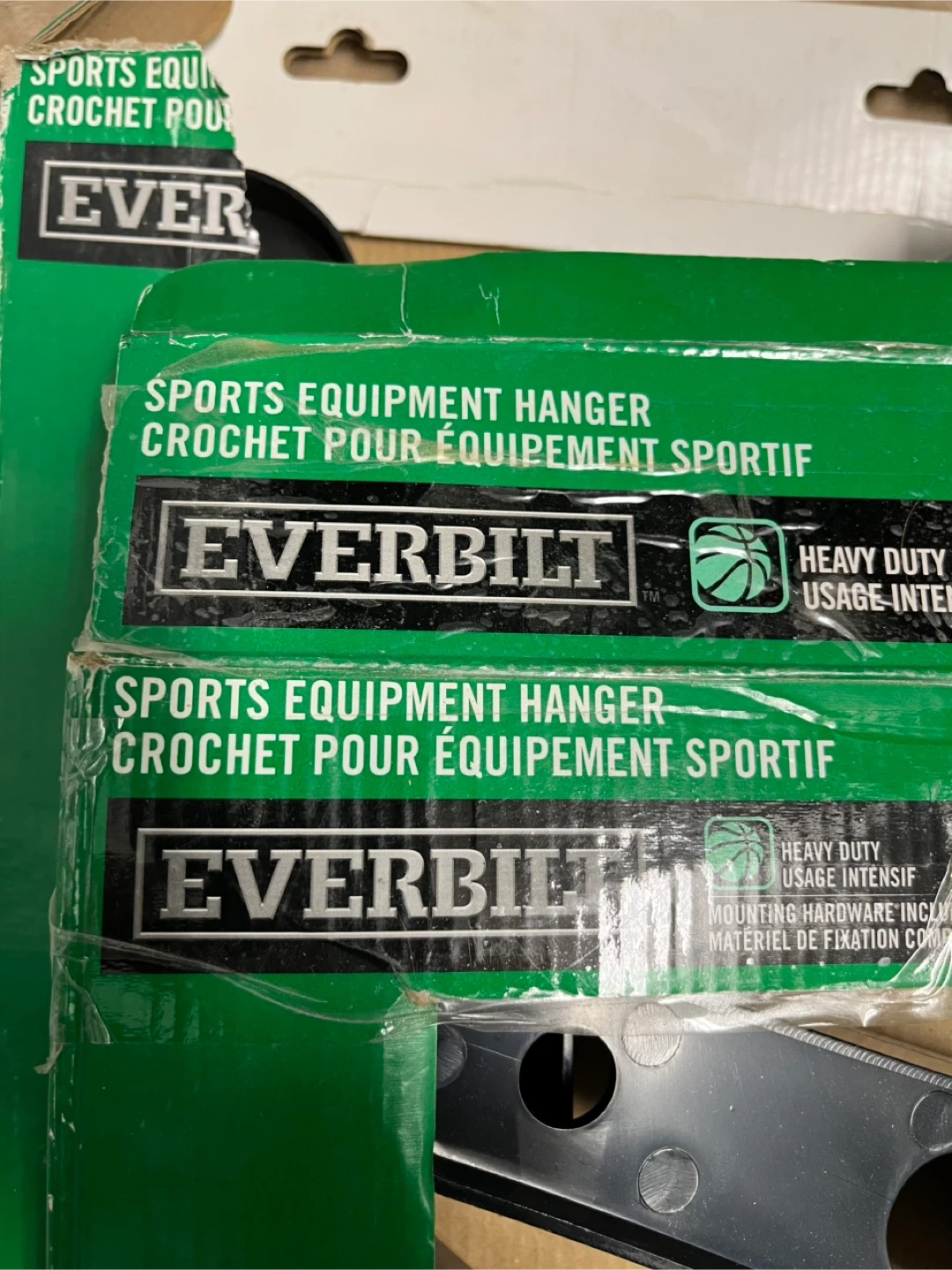 Selling an Everbilt sports equipment hanger. It's a heavy duty hanger with a 45 lbs capacity (20.4 kg). It's perfect for organizing your sports gear in the garage or storage room. Get your equipment off the floor!