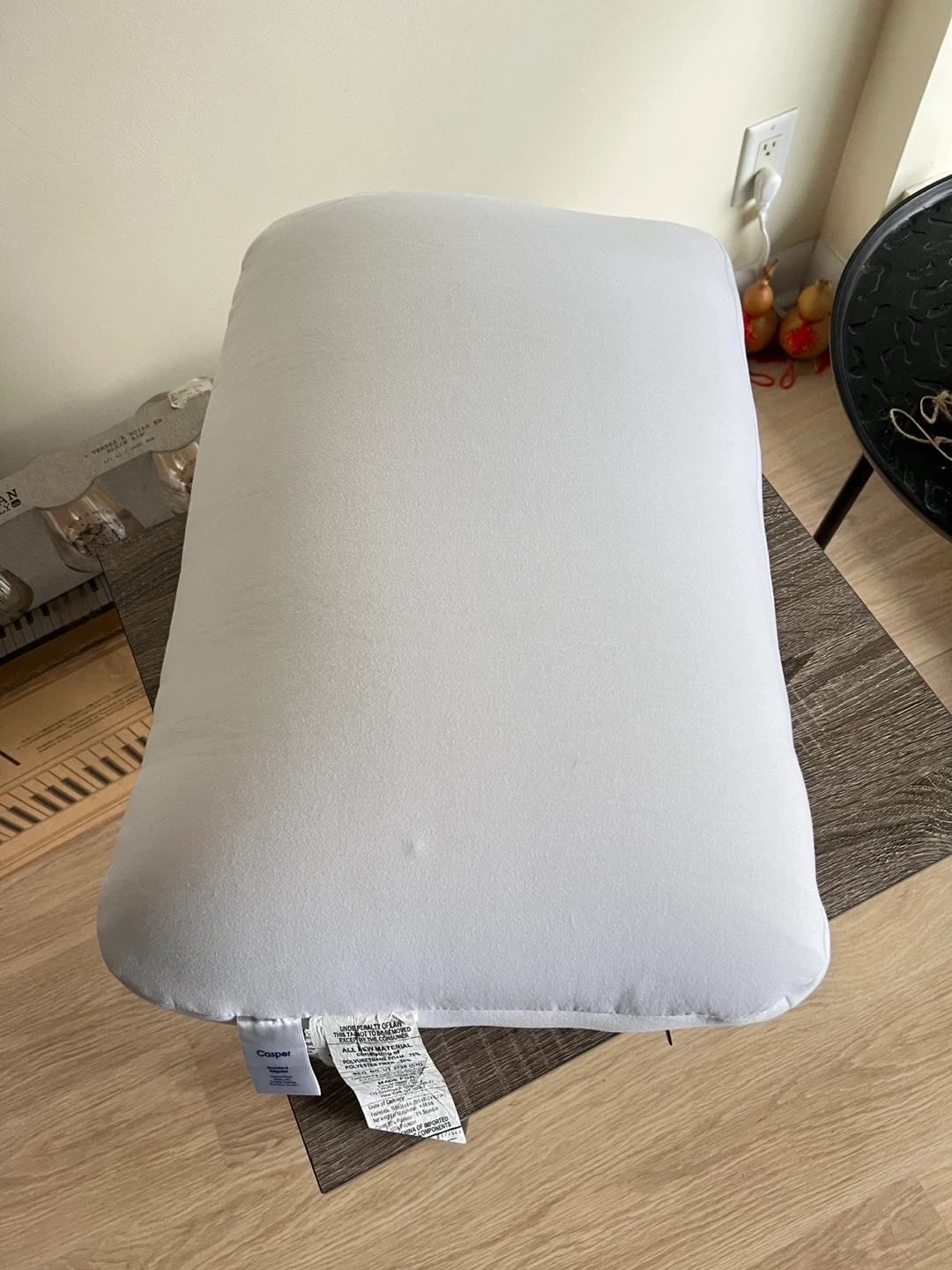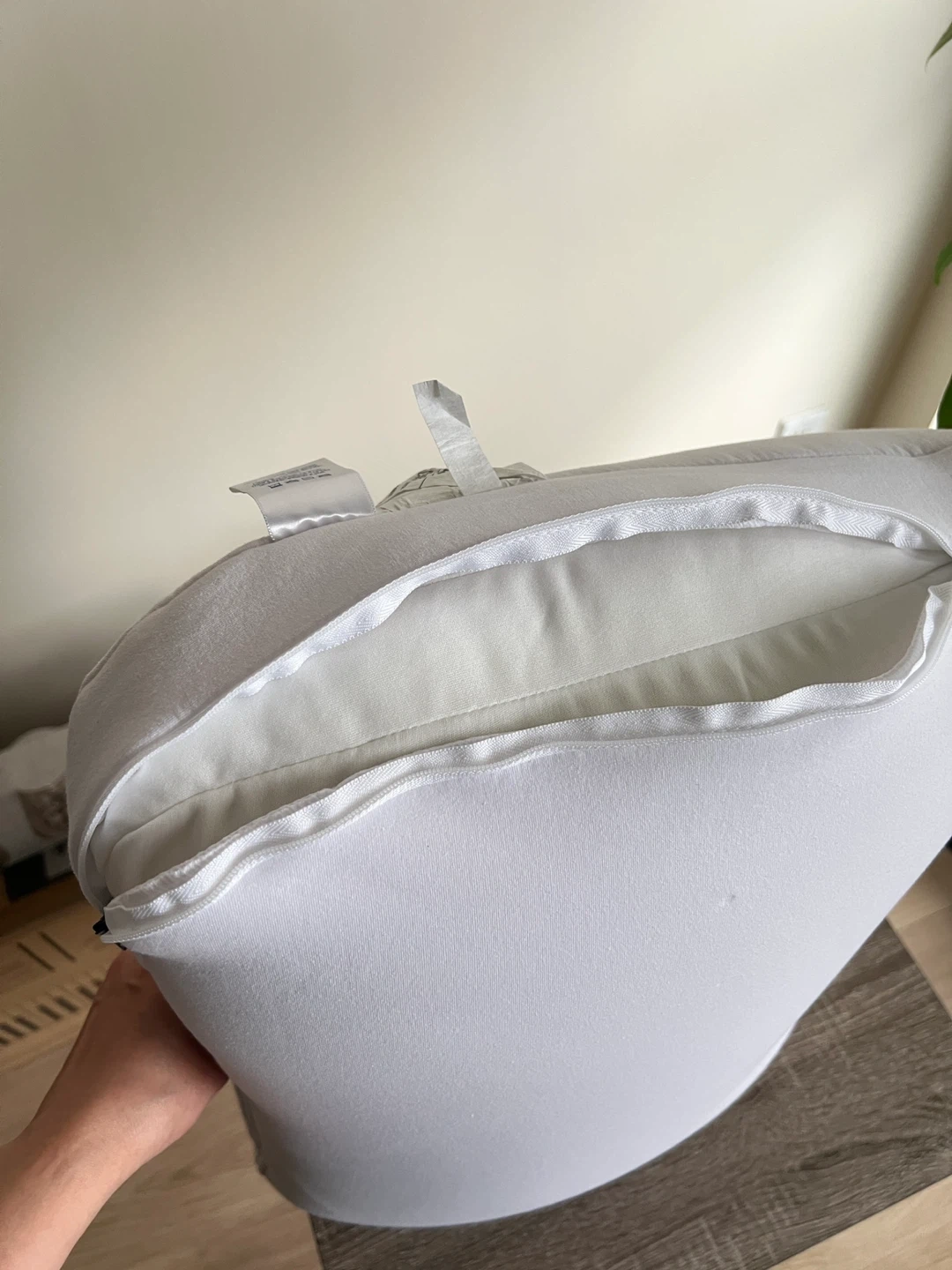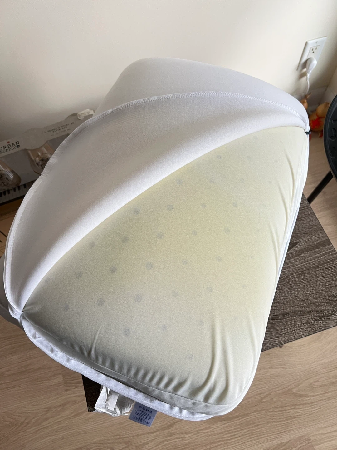 Used but it was inside a pillow protector and pillow case so it is in clean condition. No rips, holes or stains. The cover can be removed for washing. There is discoloration inside from the foam.