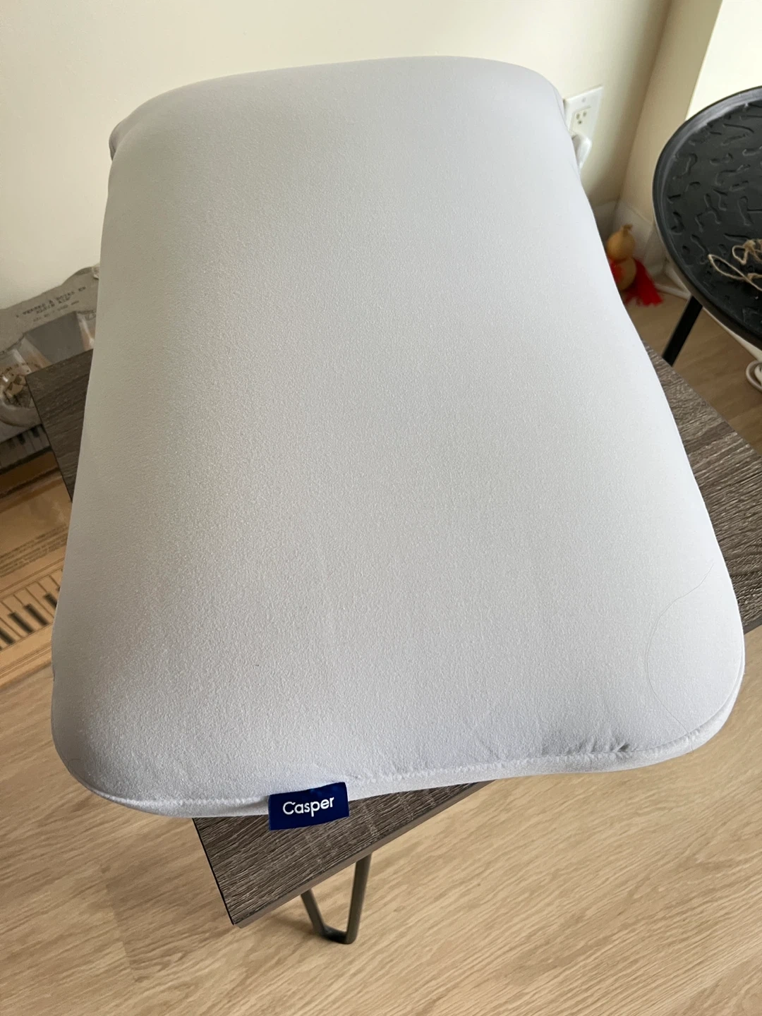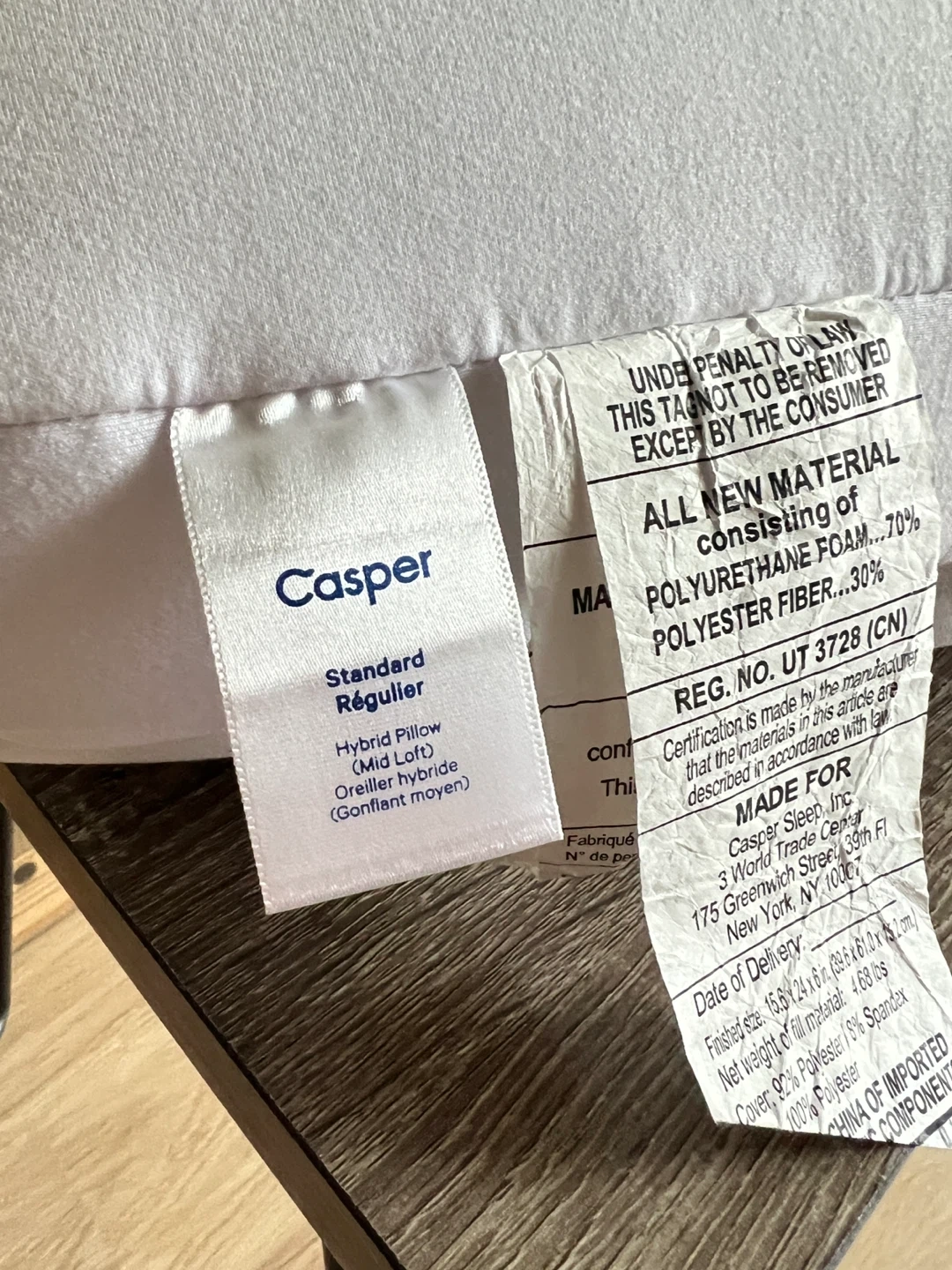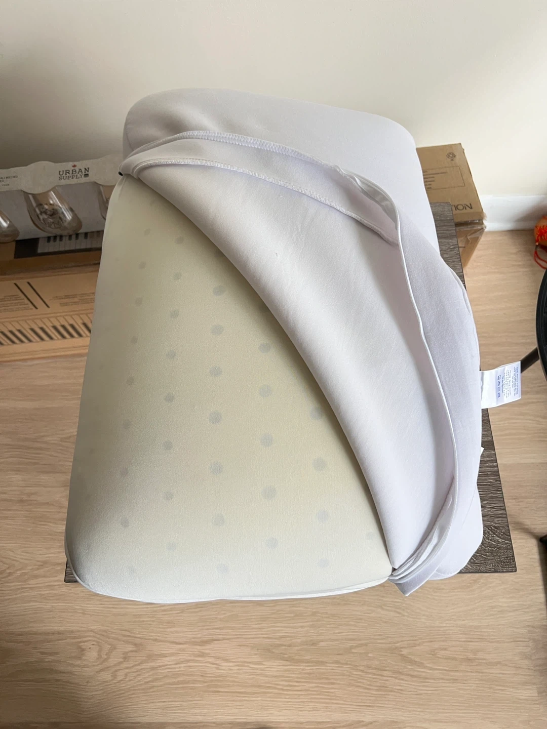 Used but it was inside a pillow protector and pillow case so it is in clean condition. No rips, holes or stains. The cover can be removed for washing. There is discoloration inside from the foam.