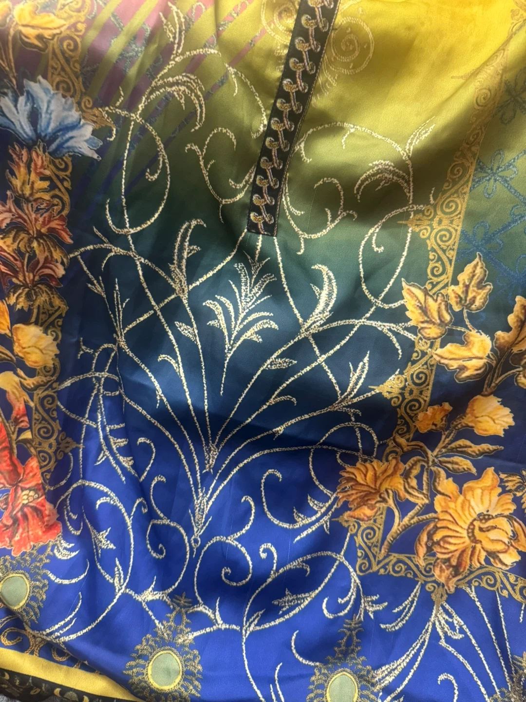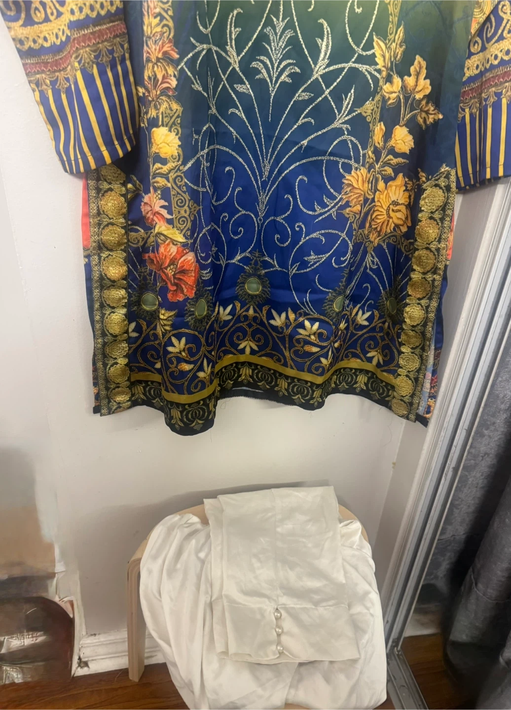 Selling a vibrant kurti with a beautiful floral print! The colours are so eye-catching, transitioning from orange and yellow at the top to green and blue at the bottom. It's in great condition and comes with matching white pants. Perfect for adding a pop of colour to your wardrobe!