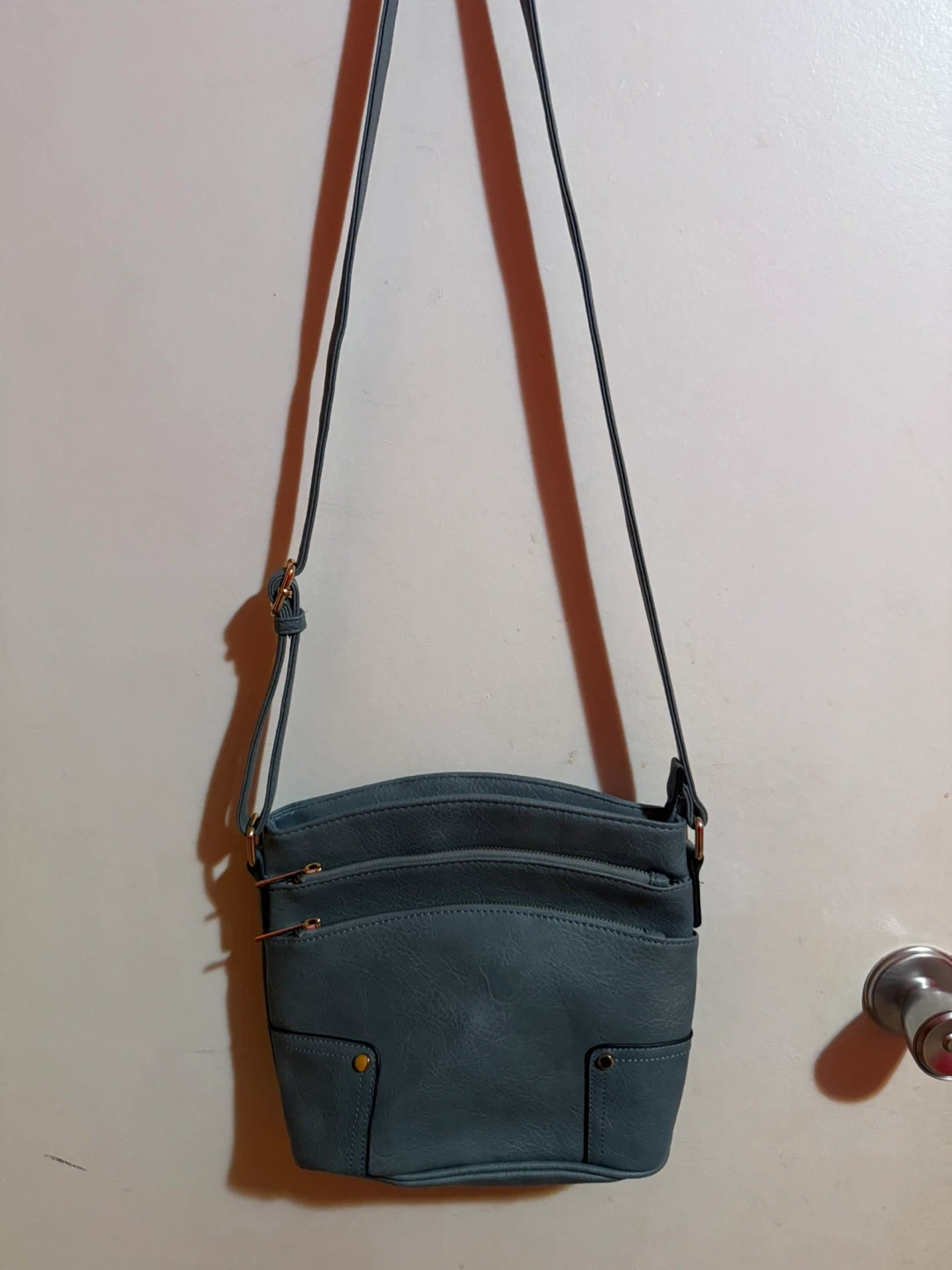 Selling a cute blue crossbody bag! It's in great shape and perfect for carrying your essentials. The bag has multiple zippered compartments to keep everything organized. The strap is adjustable so you can wear it at the perfect length