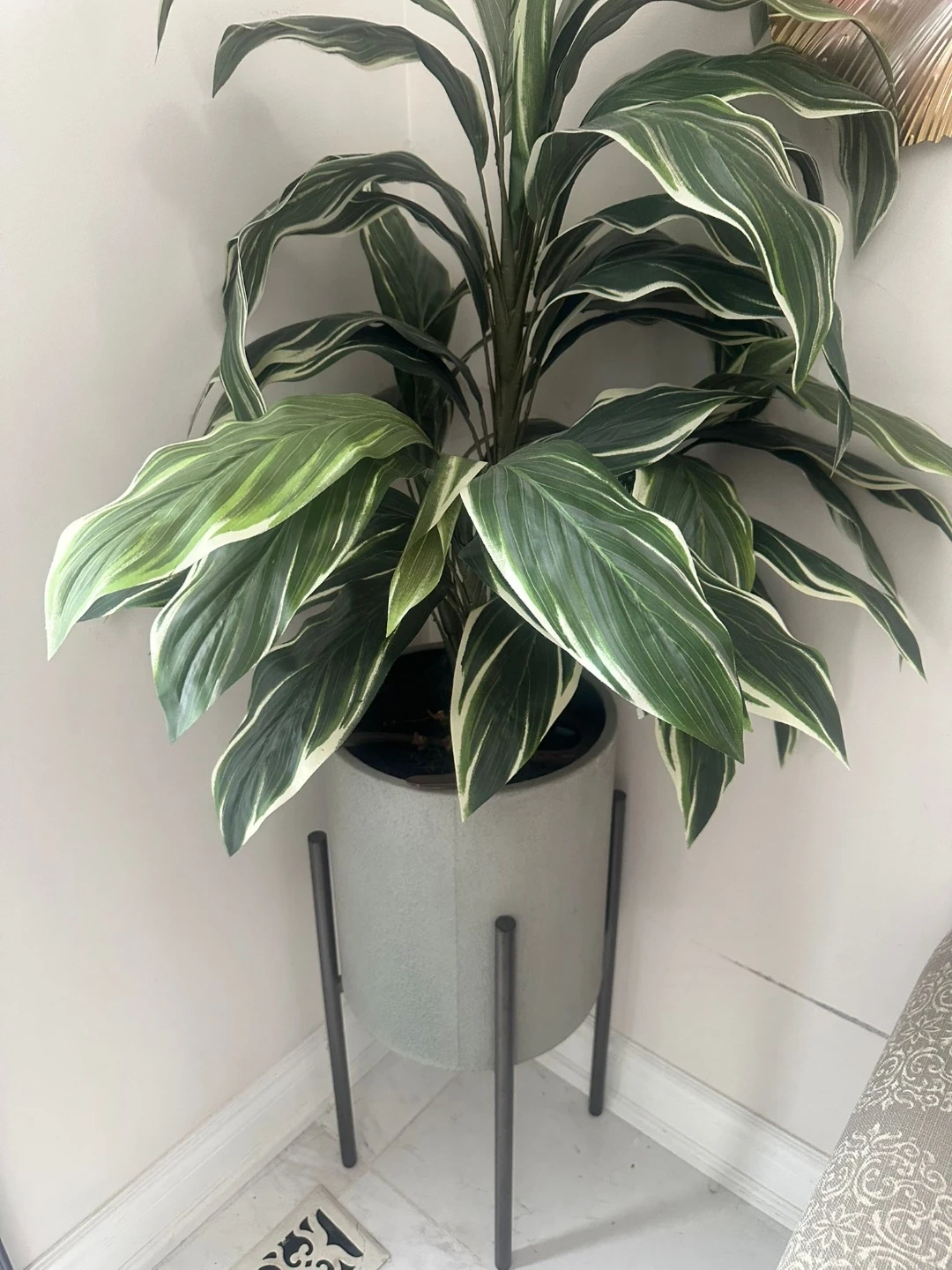 Selling a potted faux plant! It's in great condition and would be a nice addition to any room. It comes in a grey pot with a metal stand.