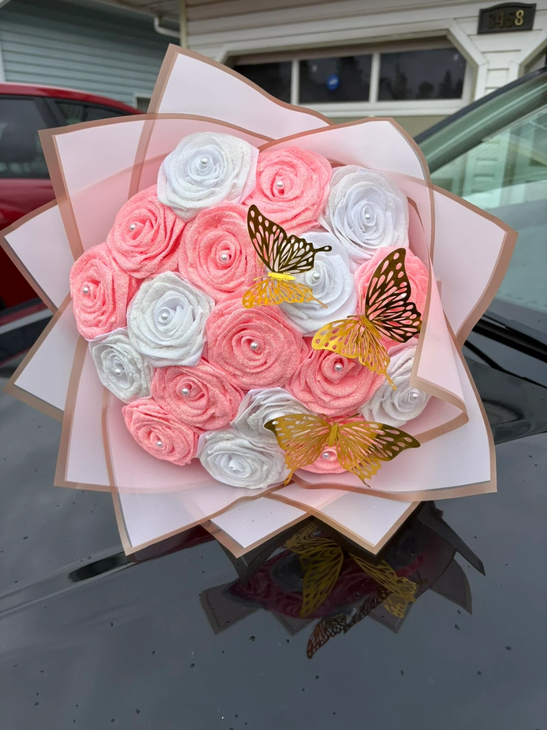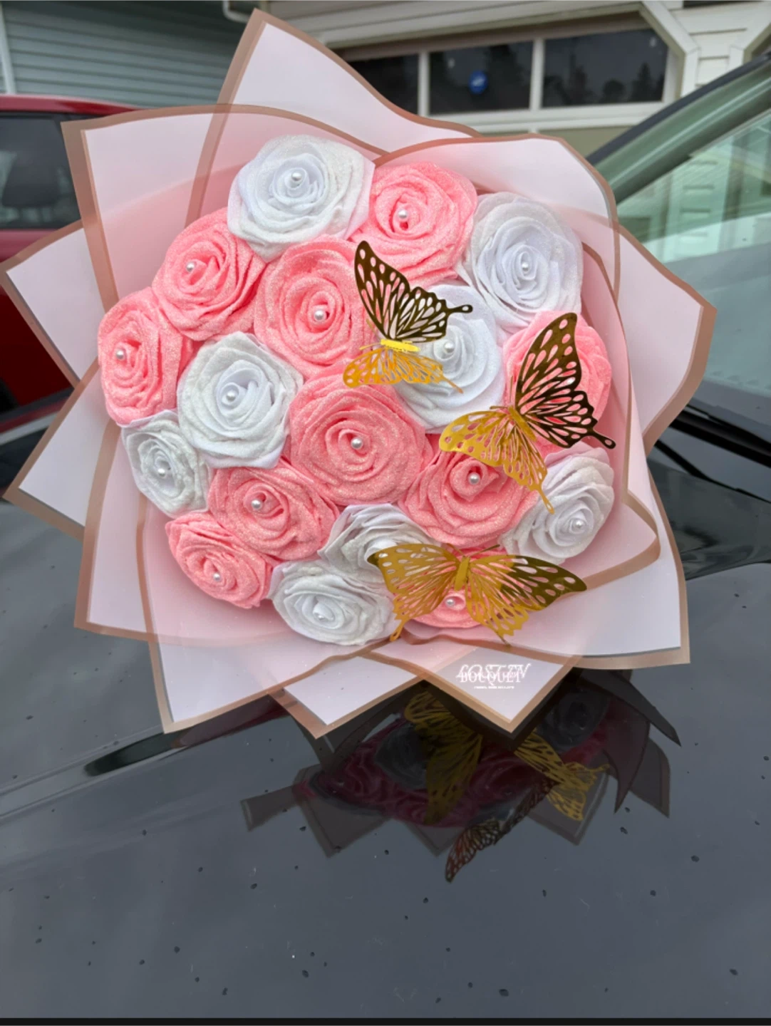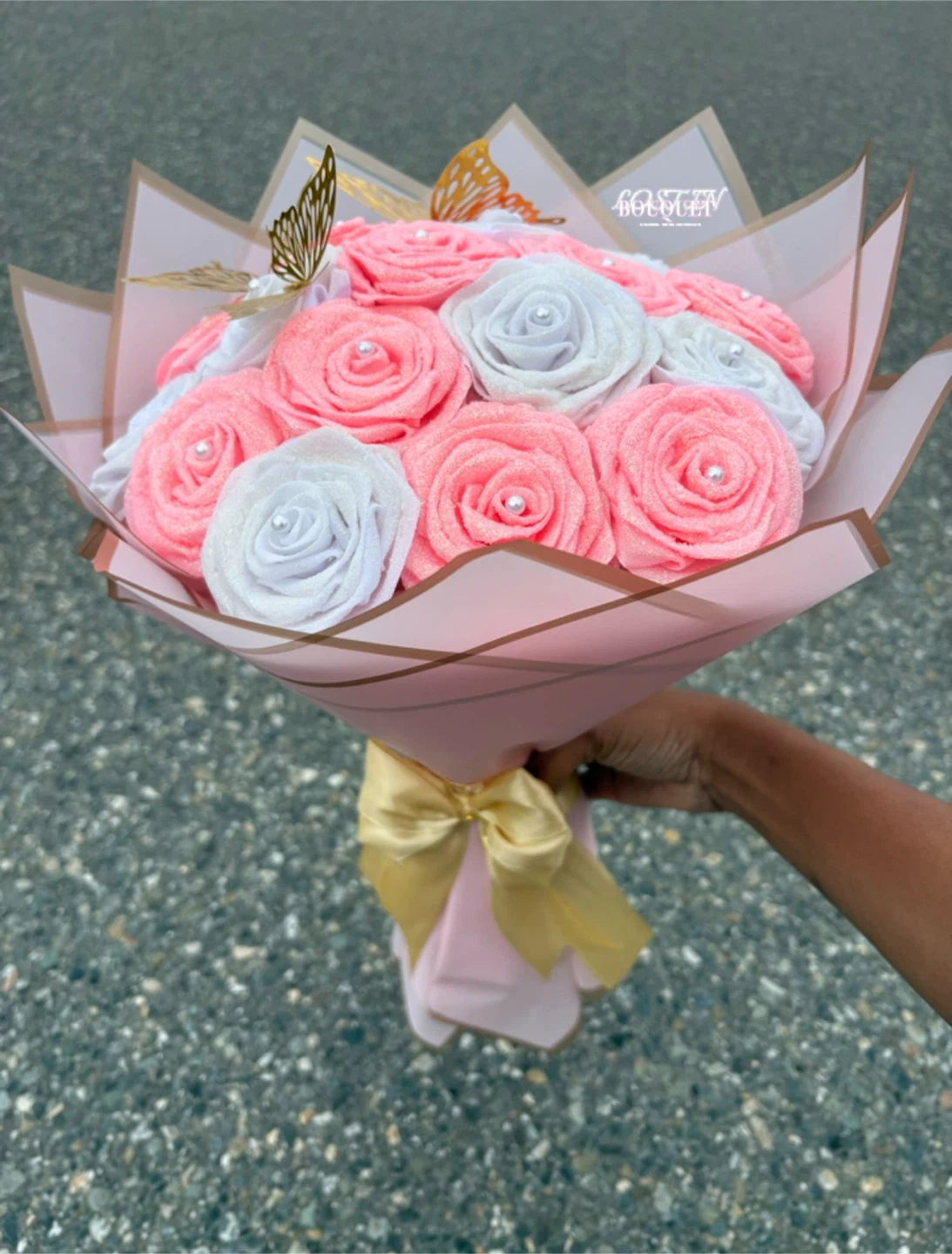 Beautiful bouquet of fabric roses, perfect for a special occasion or as a decorative piece for your home. The bouquet features a mix of pink and white roses, adorned with delicate butterfly accents. It's a lovely and unique alternative to fresh flowers!