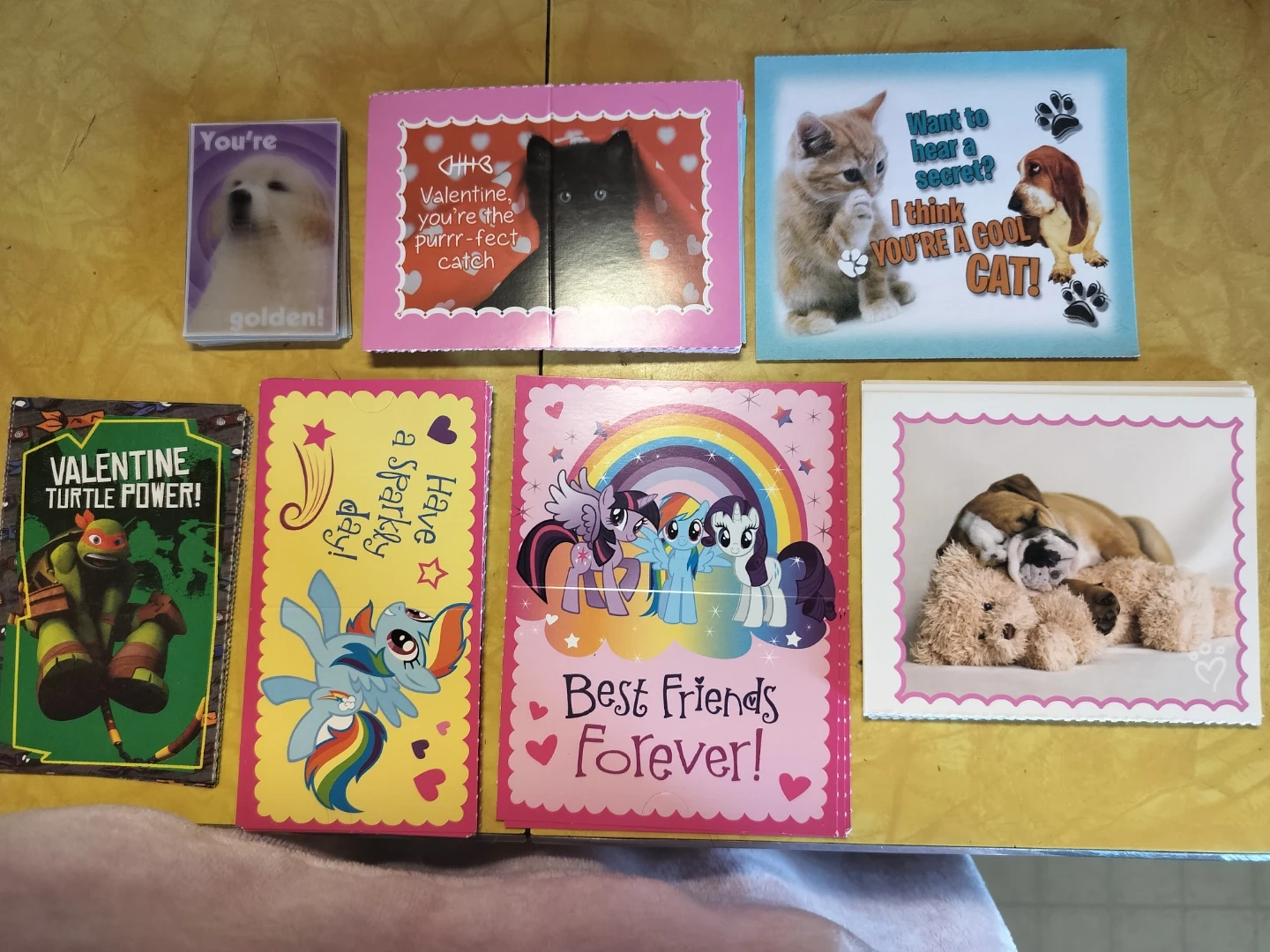 Selling a set of Valentine's Day cards with various cute designs! Includes cards featuring animals like dogs and cats, as well as characters from Teenage Mutant Ninja Turtles and My Little Pony. Perfect for spreading some love and cheer!