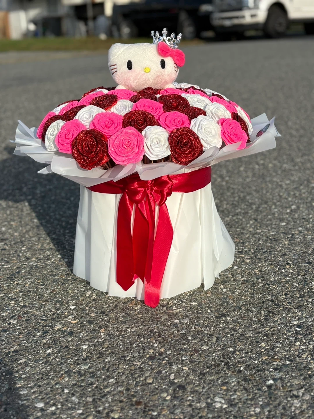 A beautiful Hello Kitty bouquet made of roses! Perfect for a gift or decoration