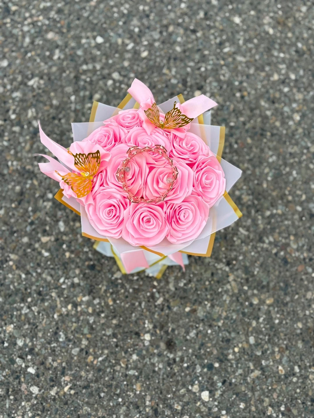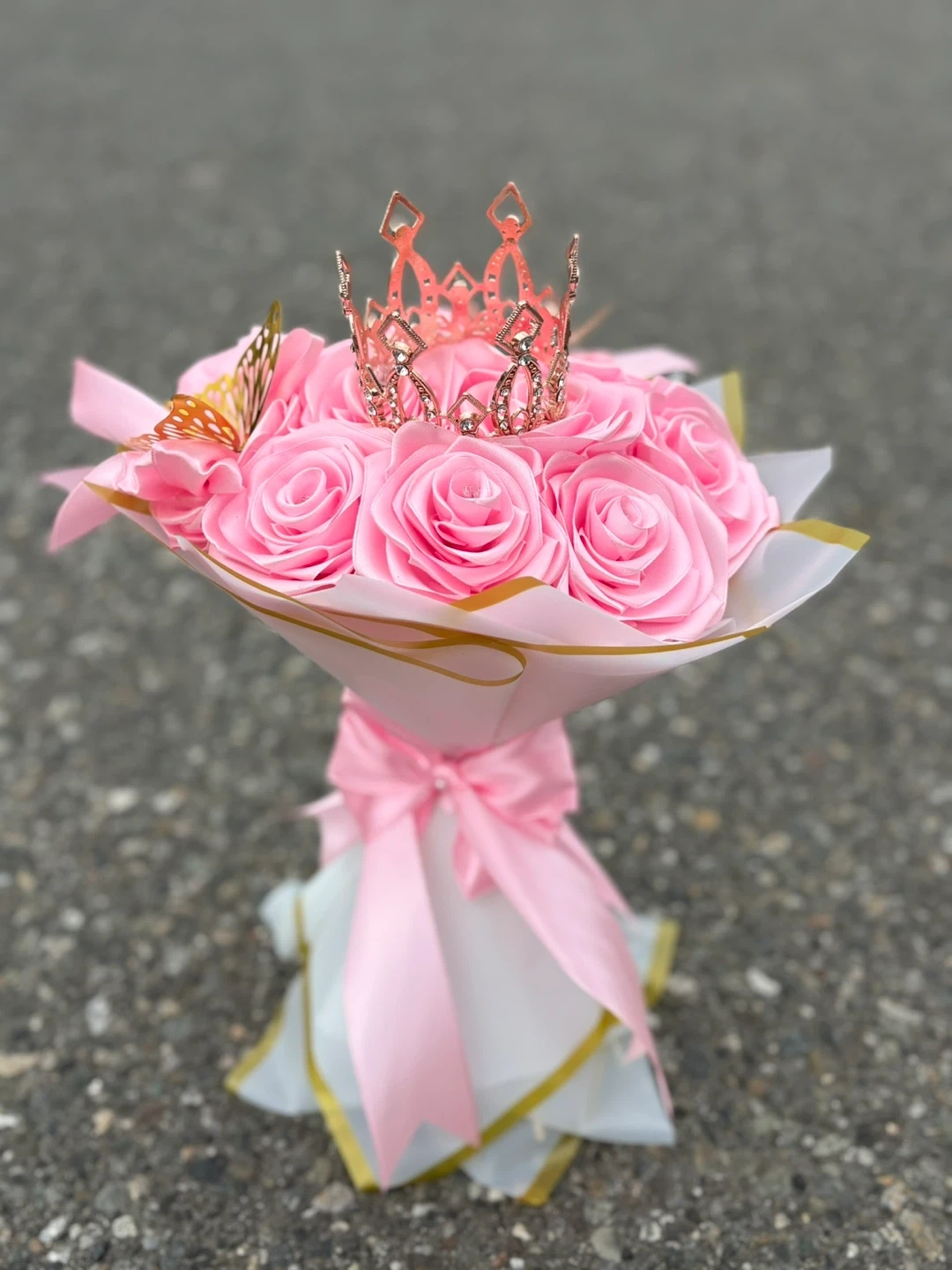A beautiful bouquet of pink roses, topped with a delicate crown and butterfly accents! Perfect for a special occasion or as a lovely gift