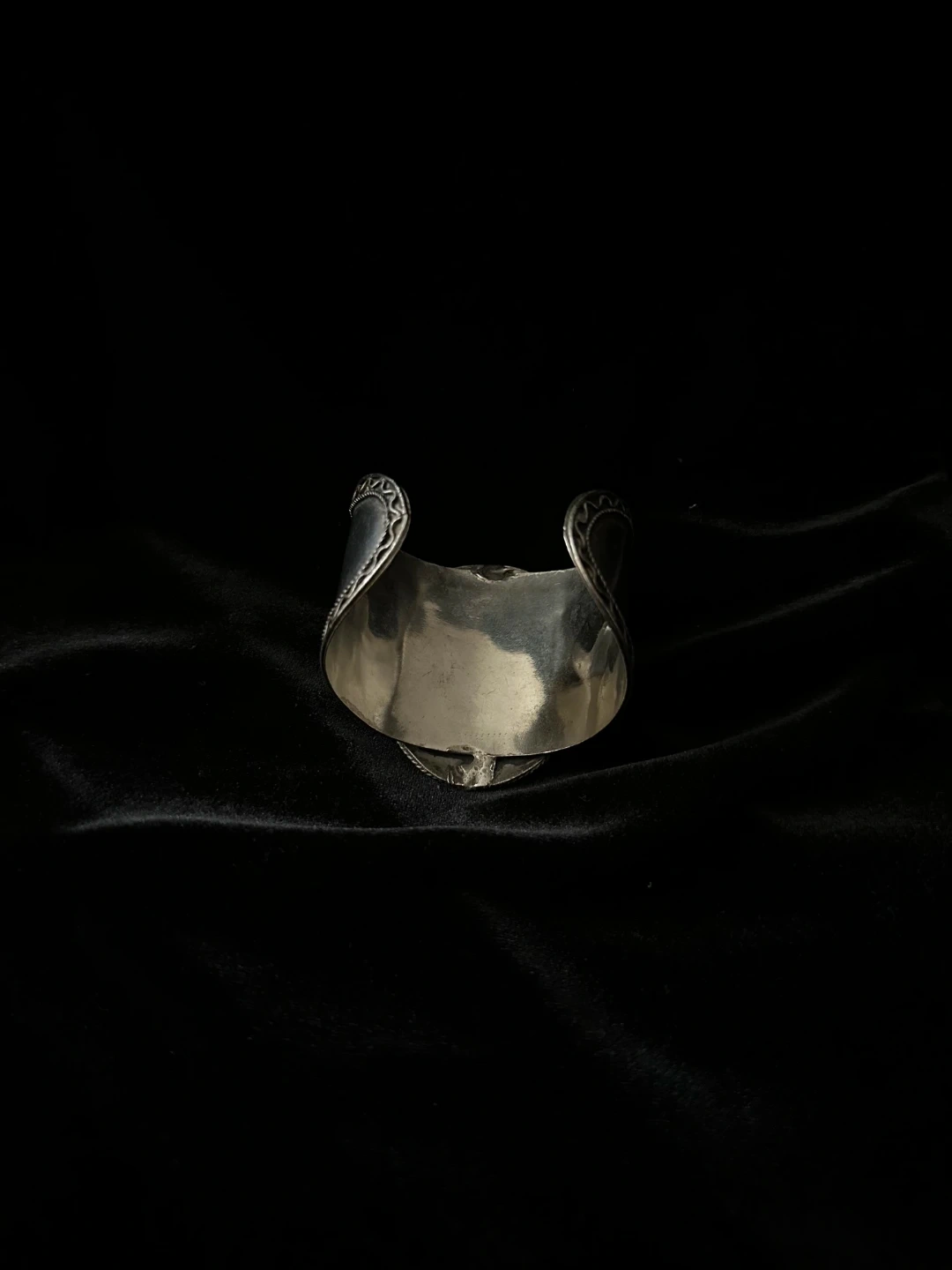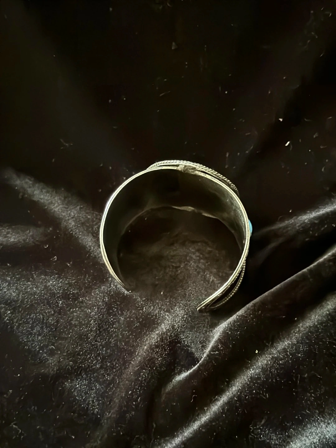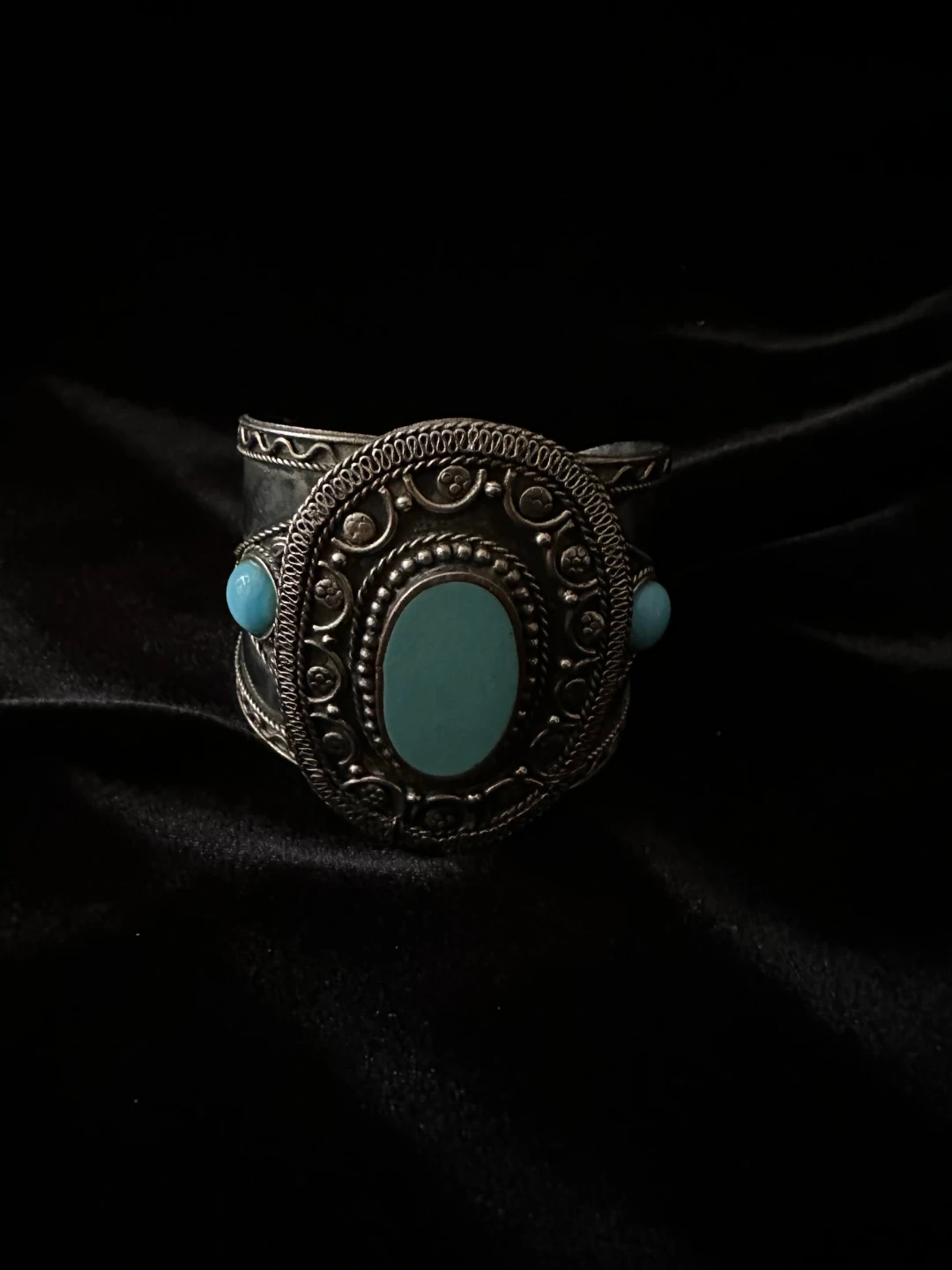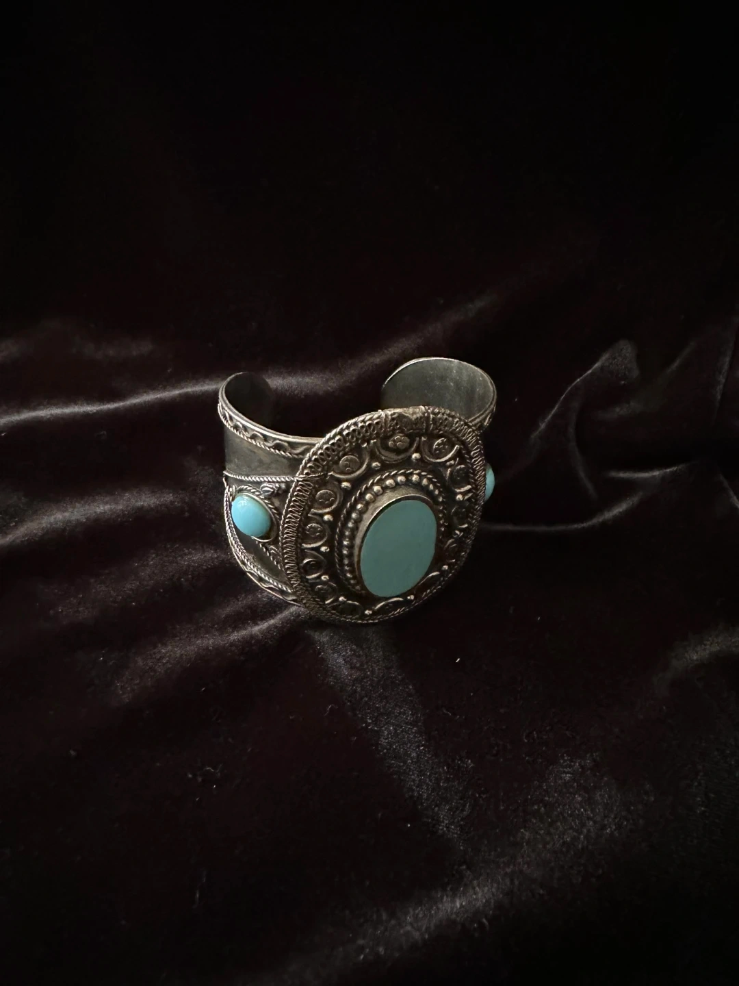 Selling a beautiful silver-tone cuff bracelet featuring turquoise colored stones. It has an intricate design and is in great condition. Perfect for adding a unique touch to any outfit!