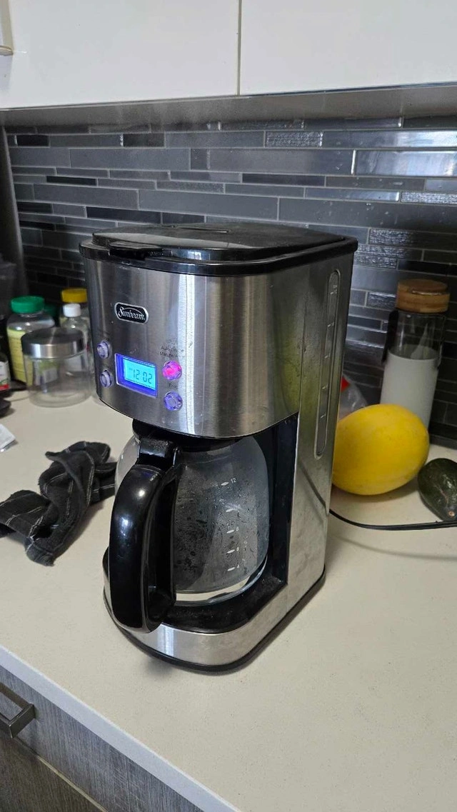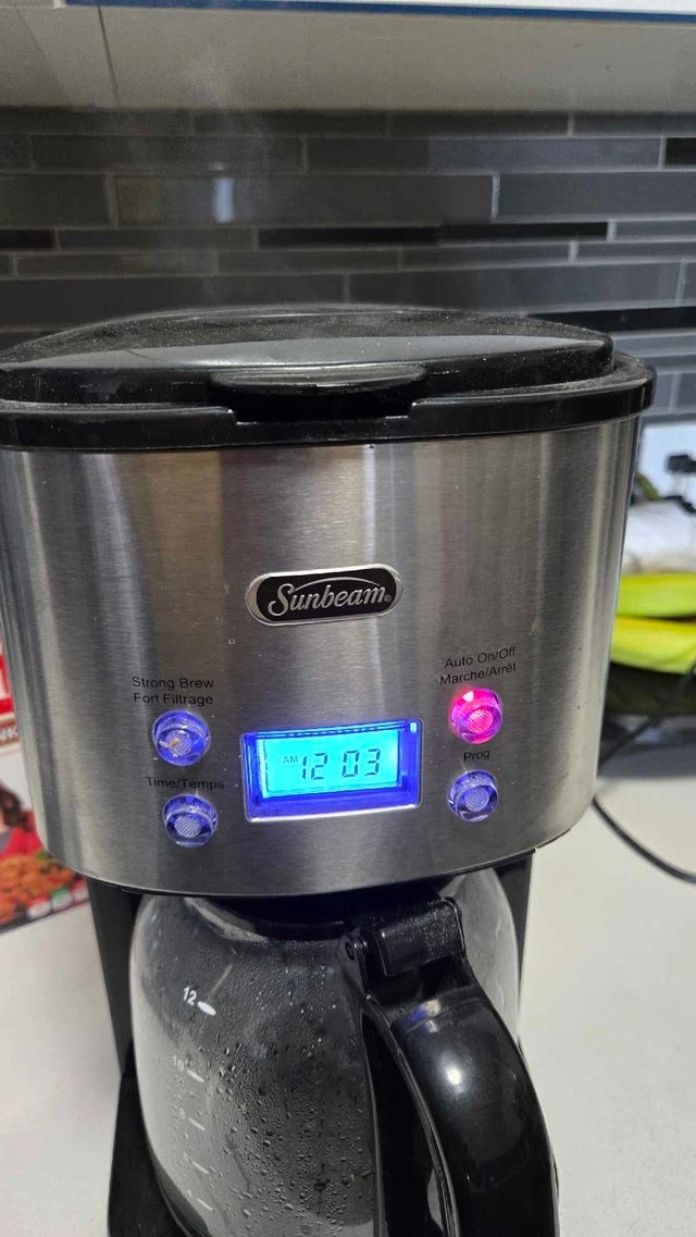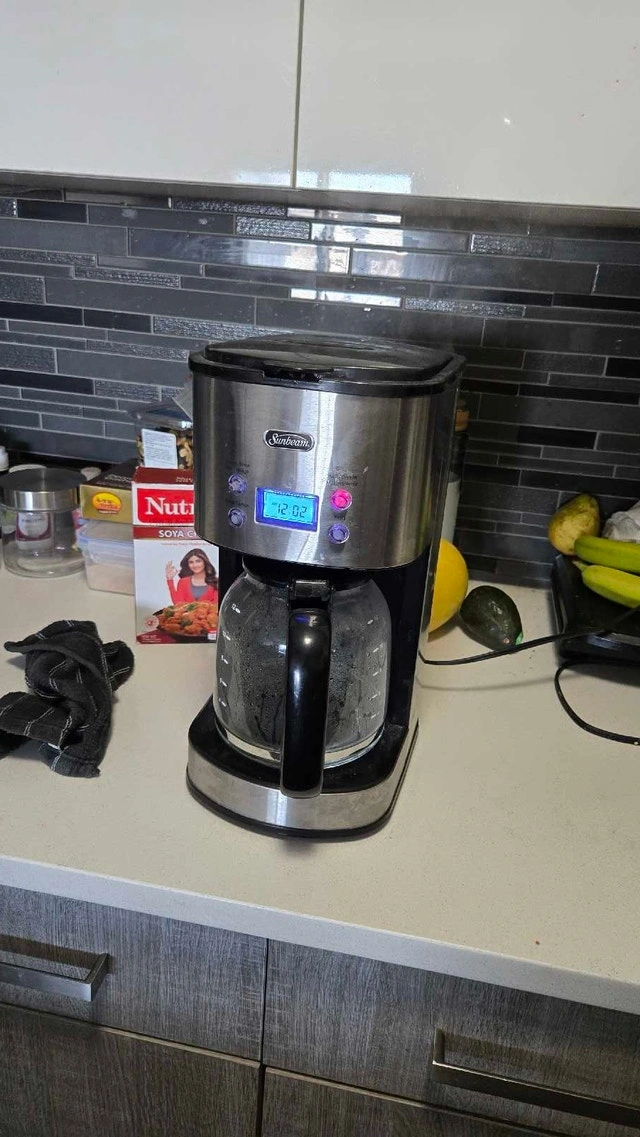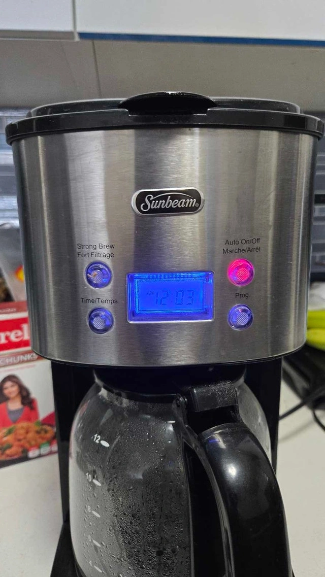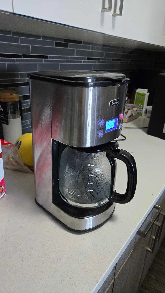 Brew your perfect morning cup with this Sunbeam coffee maker! This used appliance is in good working condition and ready to deliver delicious coffee. It features a programmable timer, allowing you to wake up to the aroma of freshly brewed coffee every day. With a 12-cup capacity, it's ideal for both individual use and serving guests. Key features include: Programmable Timer, 12-Cup Capacity, Automatic Shut-Off, Pause and Serve Function. Cash accepted.
