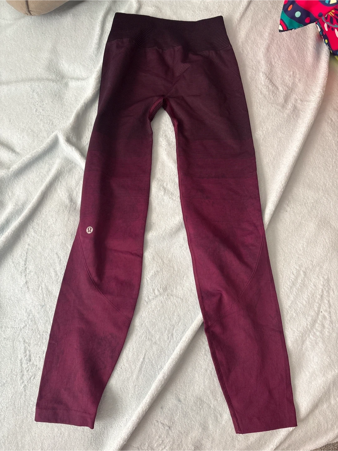 These Lululemon leggings are in great condition and ready for a new home! The burgundy colour is beautiful and perfect for workouts or just lounging around. They're super comfy and stylish! Pick up cash only size 6