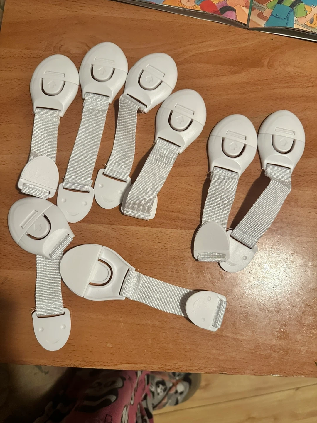 Selling a set of 8 white child safety locks. These are perfect for keeping little ones safe around the house. They're easy to install and provide peace of mind. Great for cabinets, drawers, and appliances