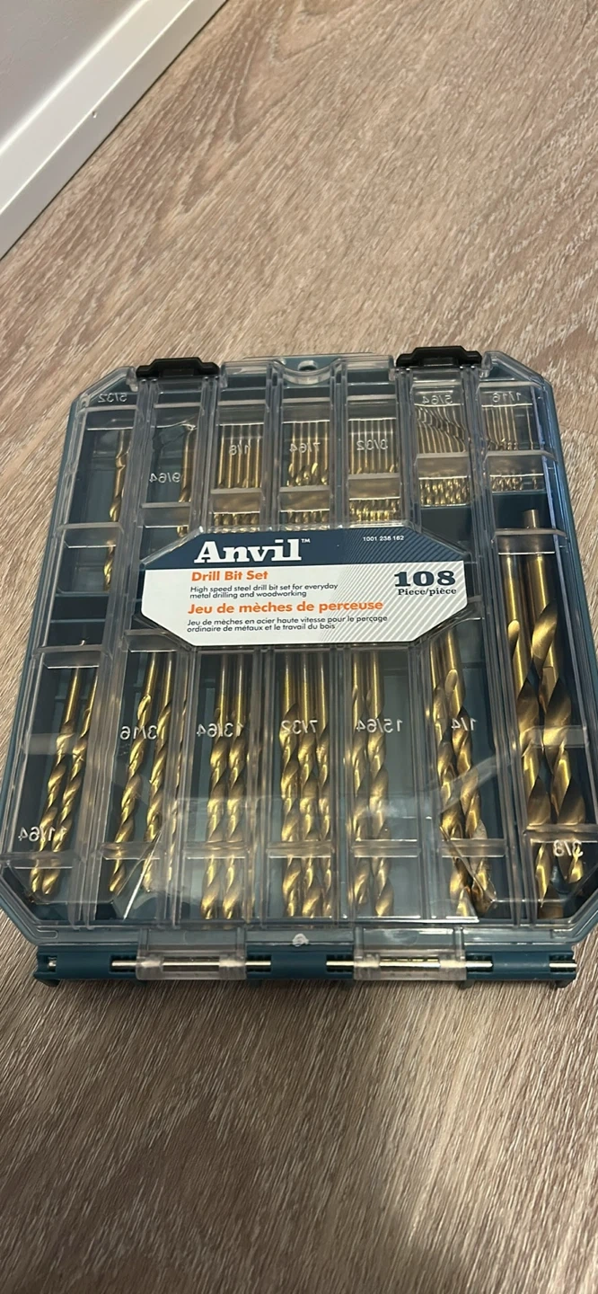 Selling an Anvil drill bit set, complete with 108 pieces! This high-speed steel drill bit set is perfect for everyday metal drilling and woodworking. It's also great for ordinary metal and wood drilling