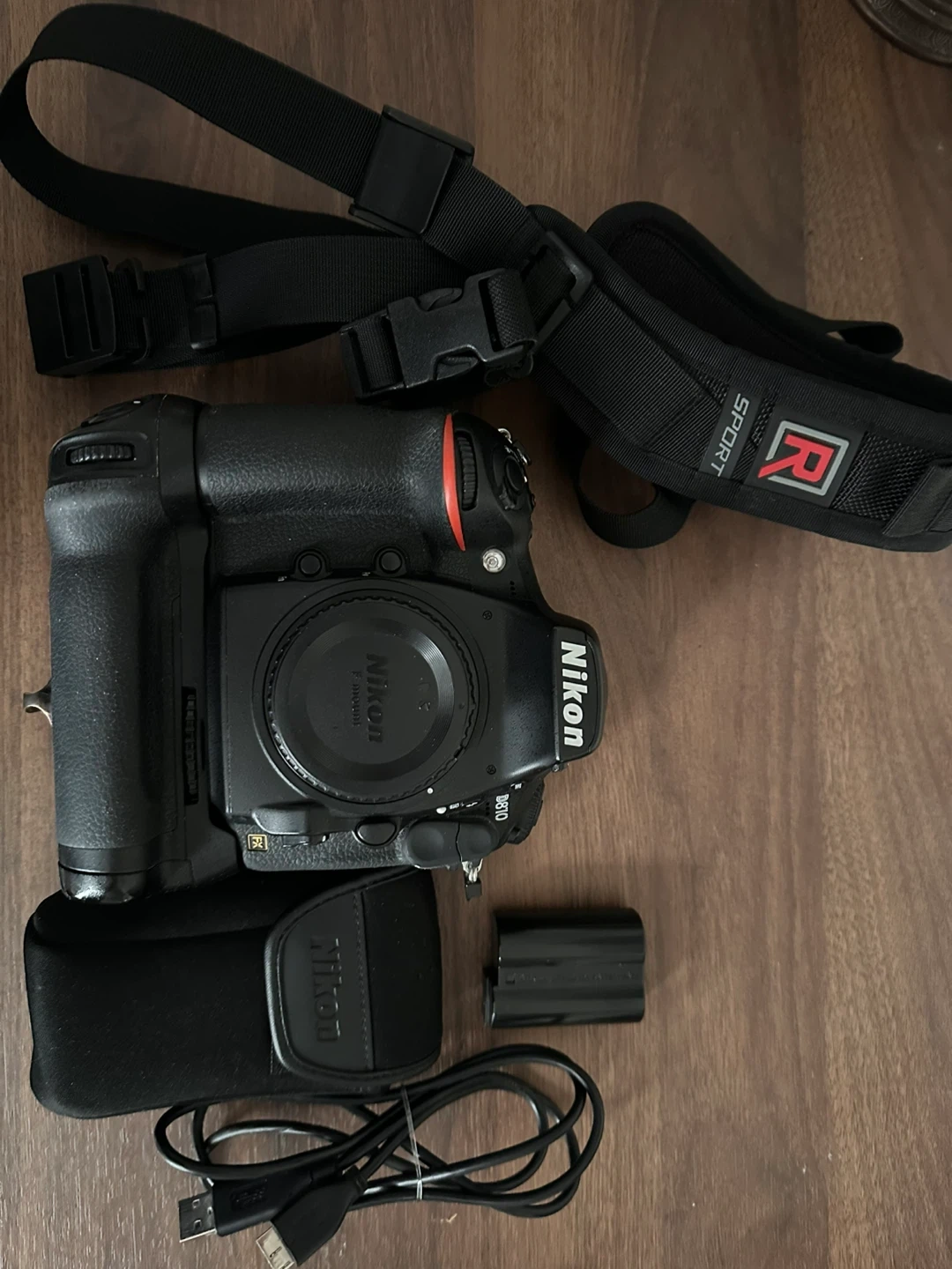 -Nikon D810 Body with Nikon removable Battery Grip, wireless shutter remote, extra batteries, Battery charger, cables and pro harness sling (35500 shutter count)