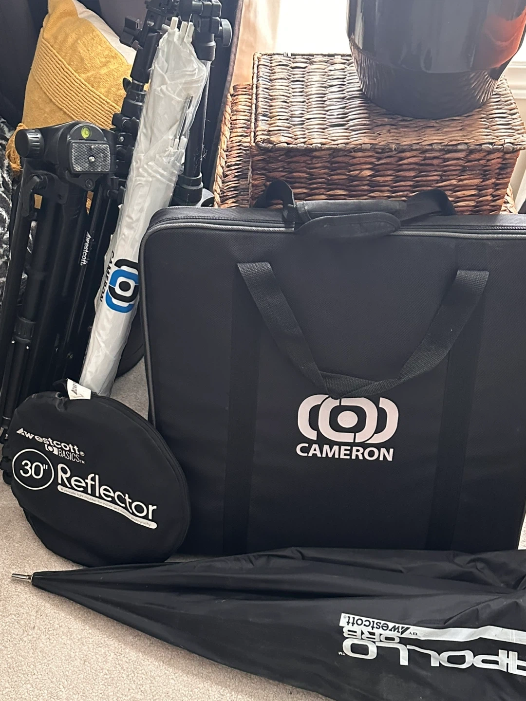 -3 - Westcott Lighting Stands, Large Apollo Orb Softbox Umbrella, White Umbrella, 30” Reflector, Cameron Large Ring Light and connectors for off-camera speedlights,2- Continuous lighting lamps on stands