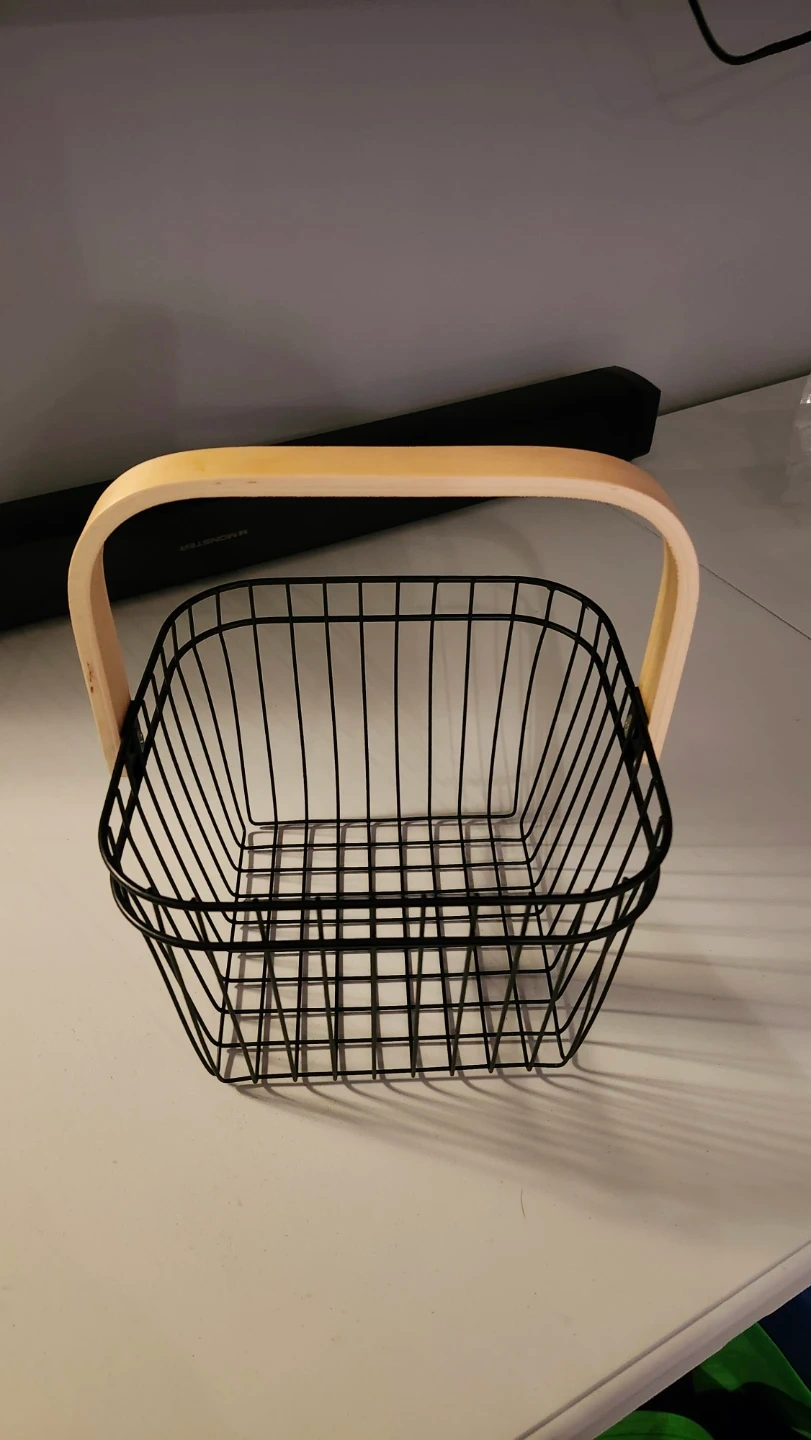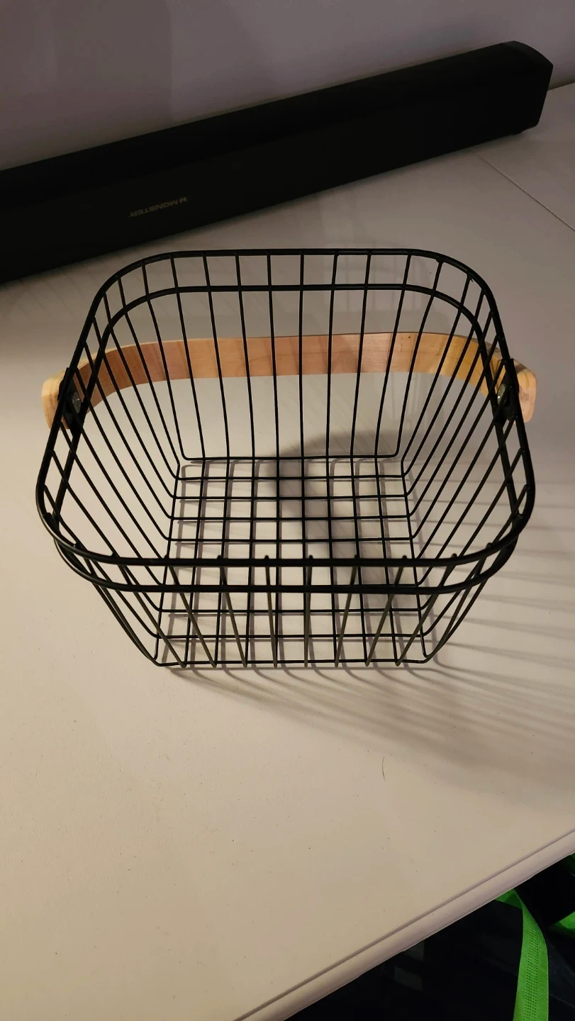 Here's a stylish black metal basket with a light wood handle! It's perfect for organizing items around the house or even as a decorative piece. The metal wire design gives it a modern look, while the wooden handle adds a touch of warmth. It's in great condition and ready for a new home