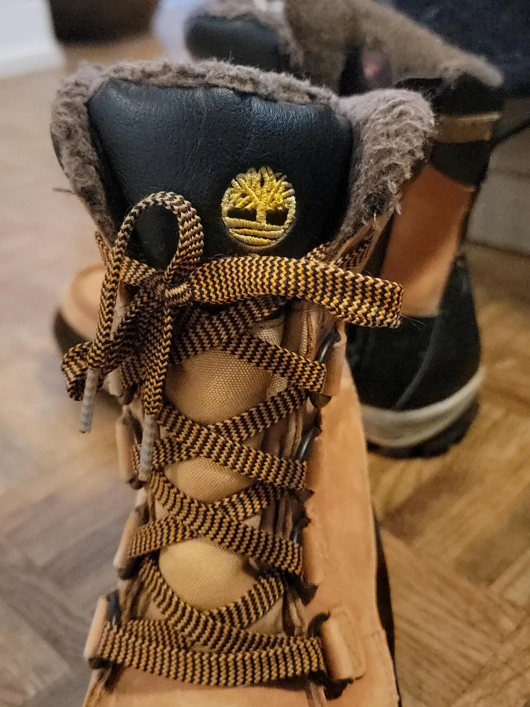 Selling a pair of Timberland boots! They're in good condition and ready for the winter season. They have a black and tan colour and feature a cozy fur lining.