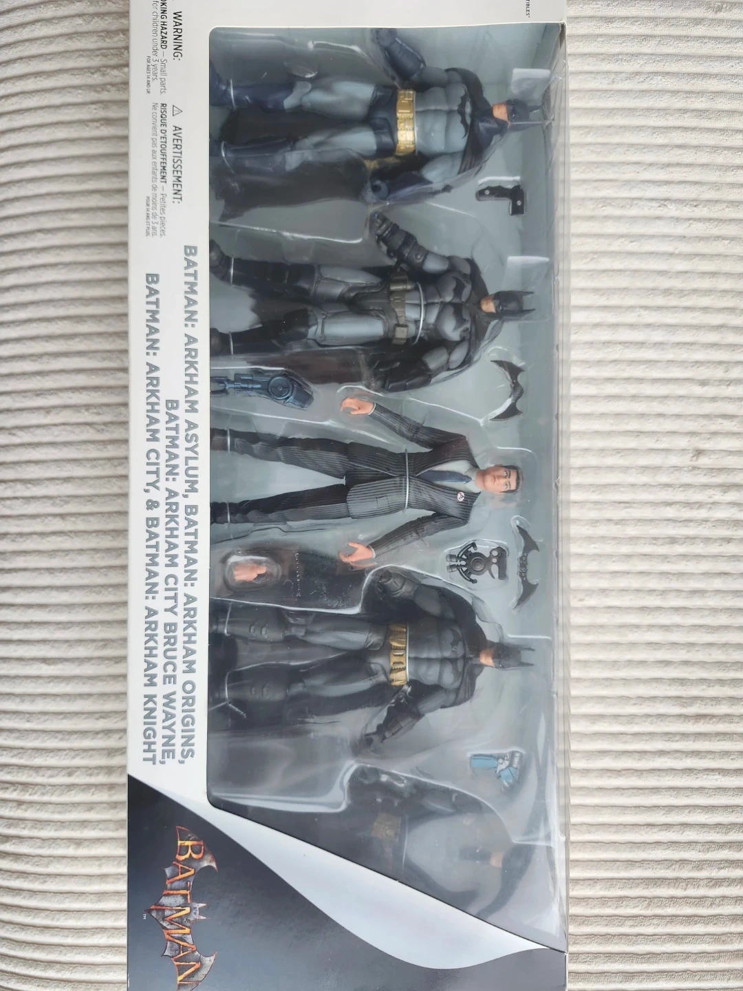 Selling a Batman action figure set featuring characters from Arkham Asylum, Arkham Origins, Arkham City, and Arkham Knight! This set includes Batman and Bruce Wayne figures. Suitable for ages 14 and up
