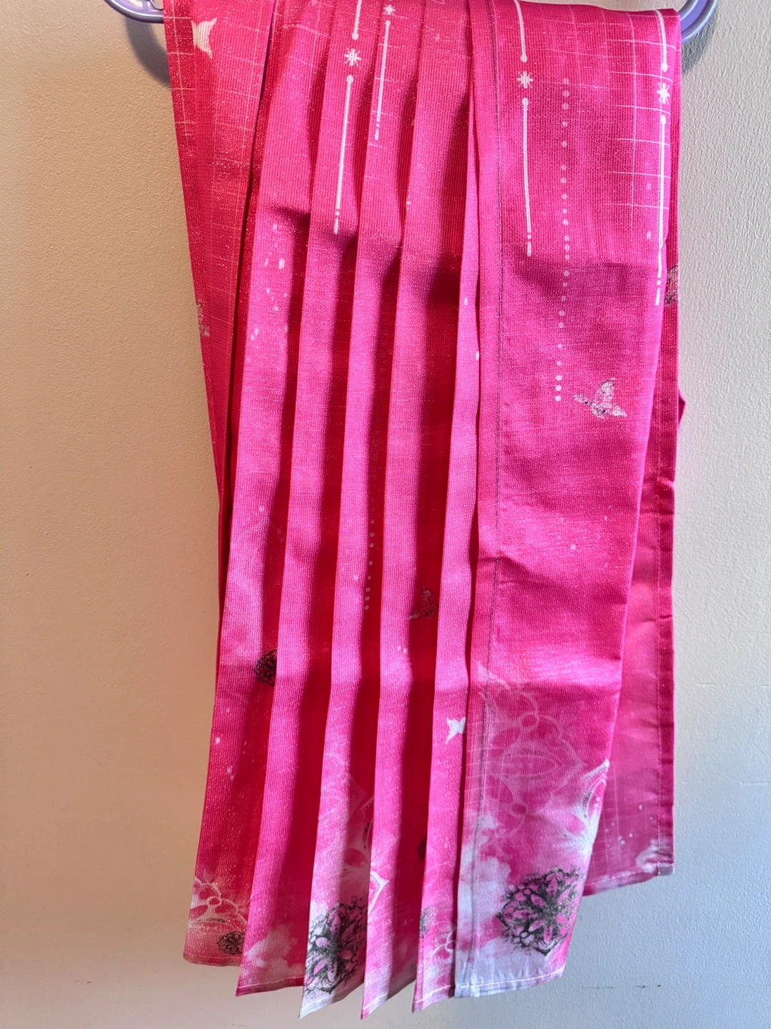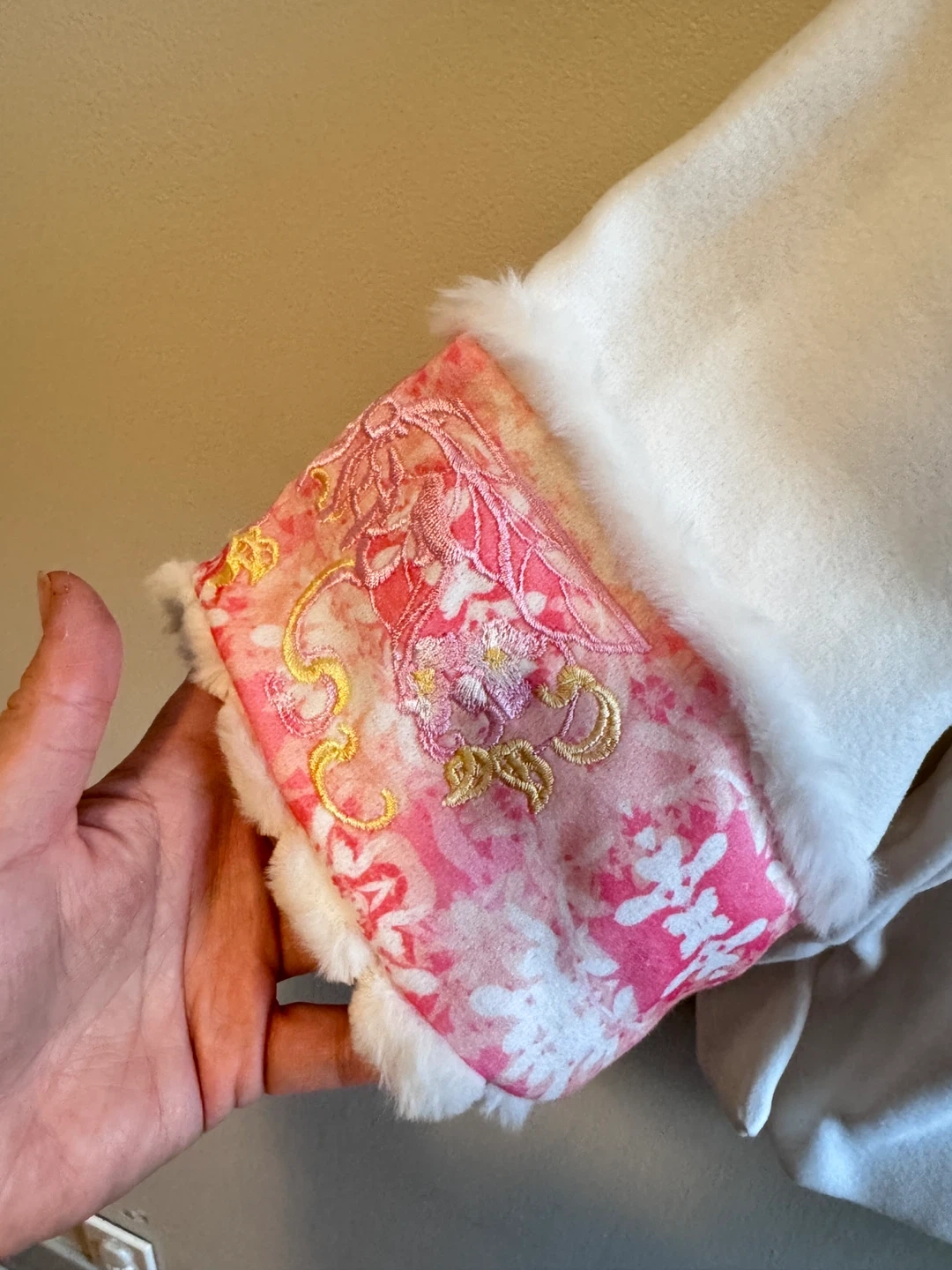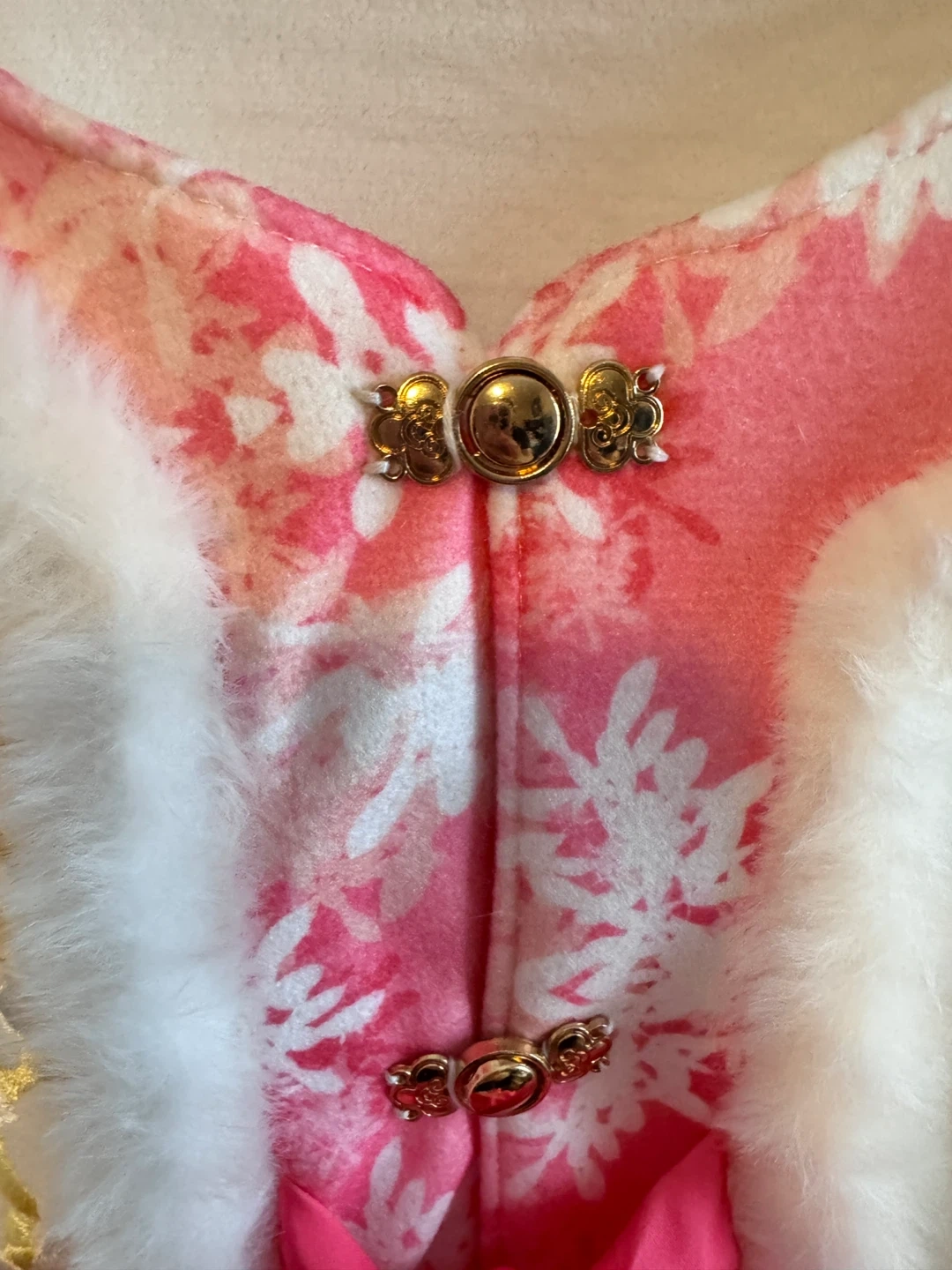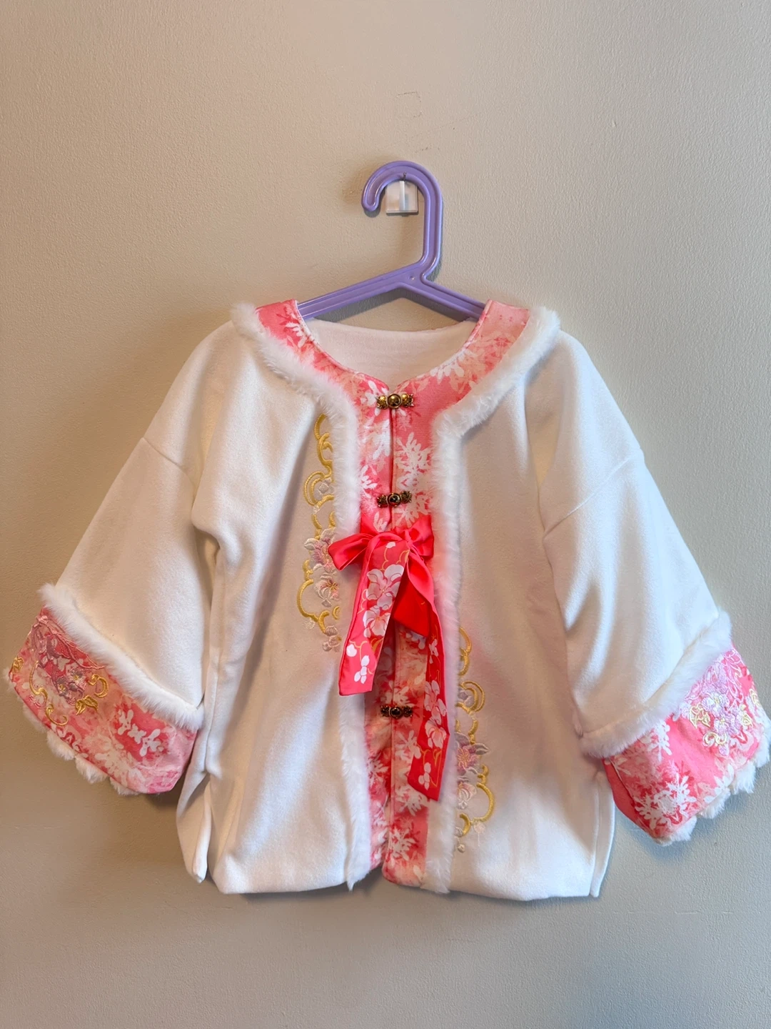 Selling a super cute pink kids' outfit! It features a lovely pink skirt and a white jacket with pink floral details and fur trim. Perfect for your little one!