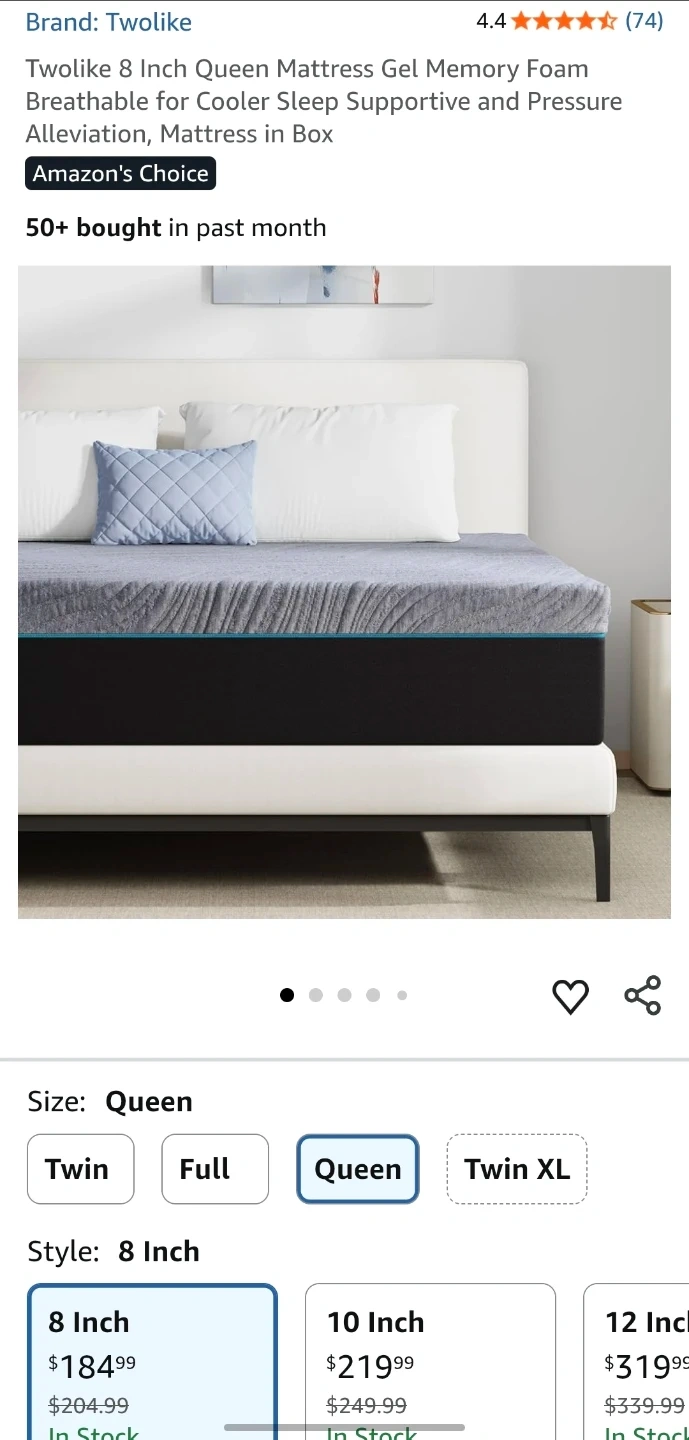 1. Twolike 8" gel memory foam mattress (comfy, cooler sleep)