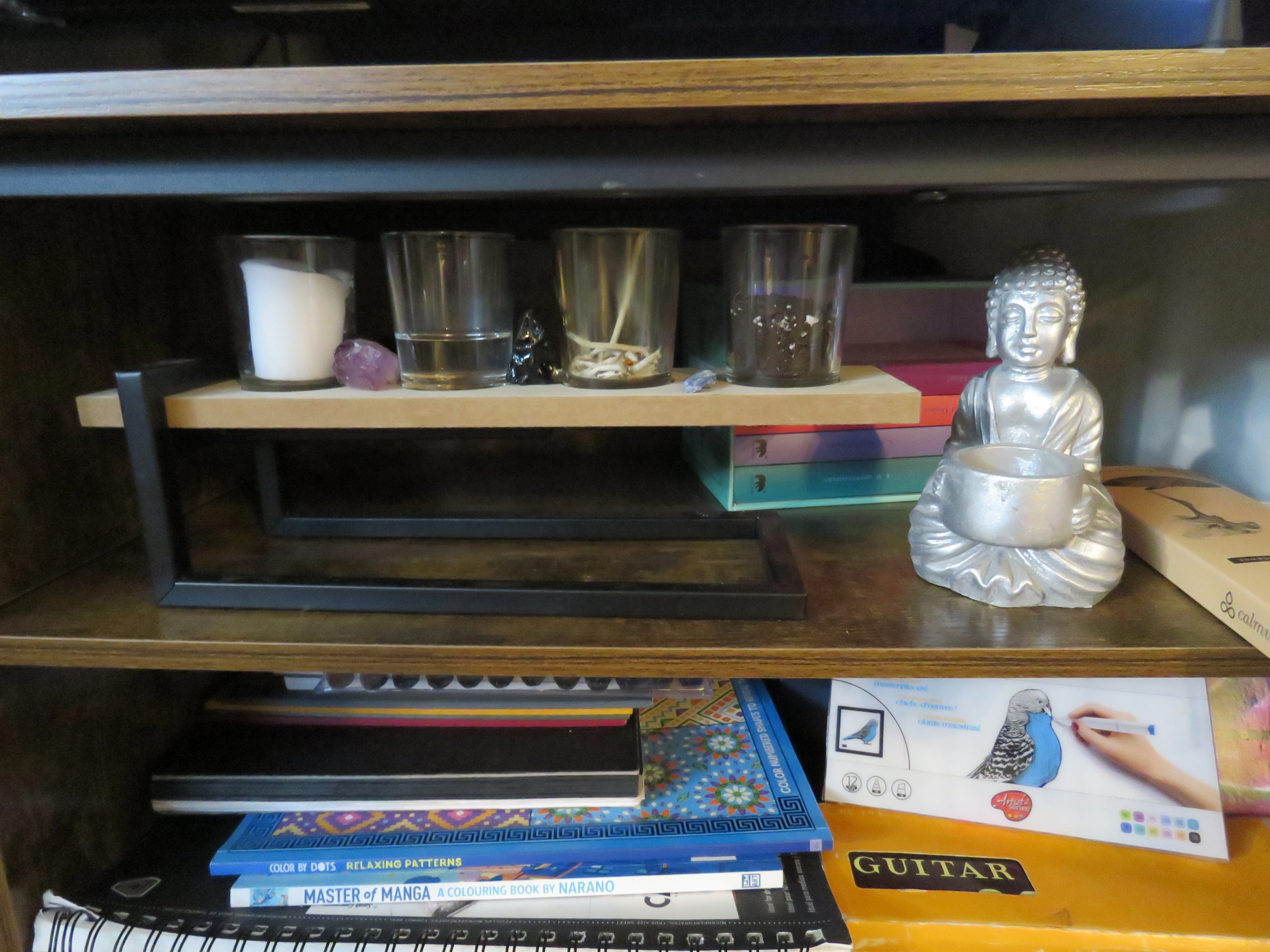 Wood and metal shelf + 4 glases & Buddha