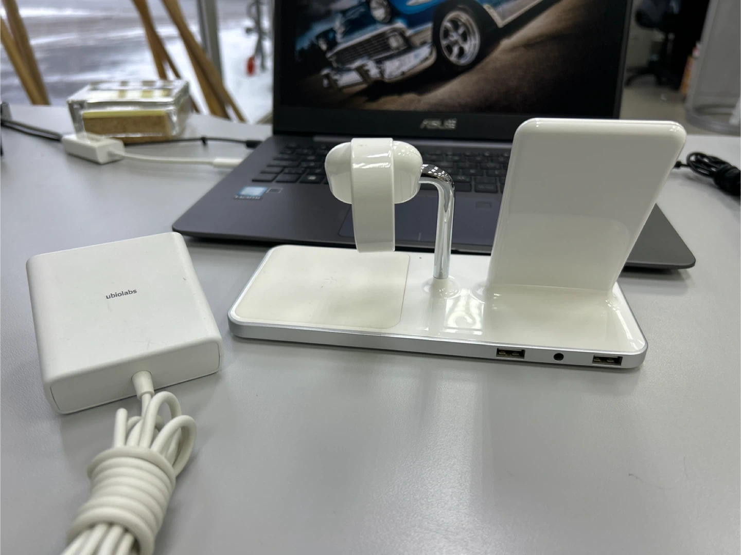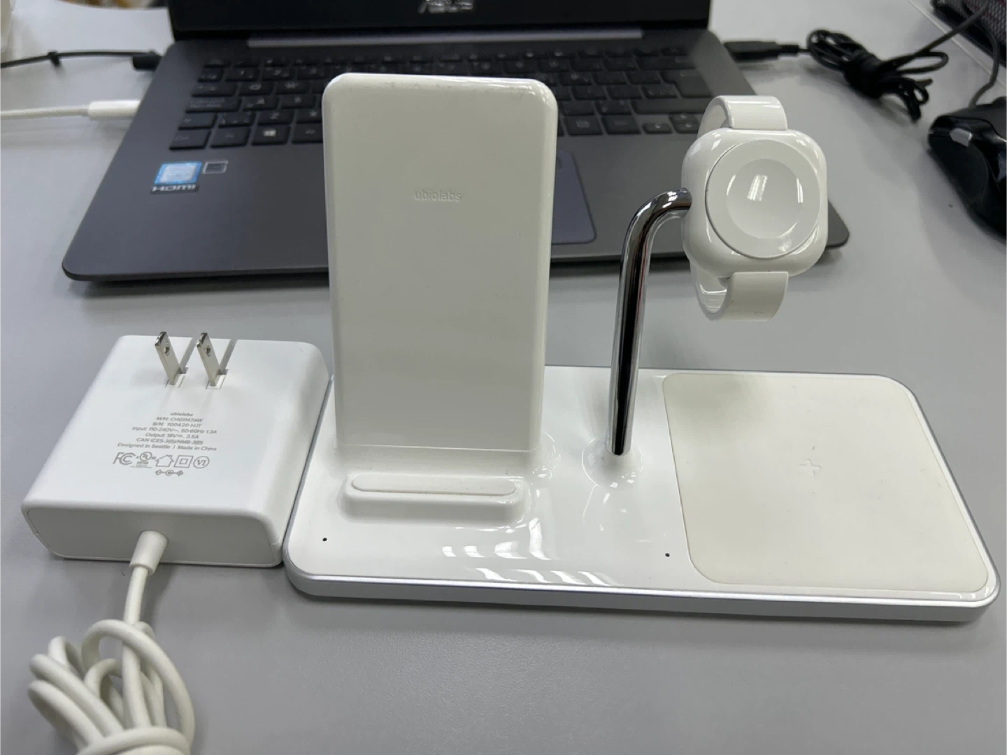 Selling a Ubio Labs 3-in-1 charging stand! It's perfect for charging your phone, Apple Watch, and AirPods all at once. The model number is AWC1070. Includes the charger!