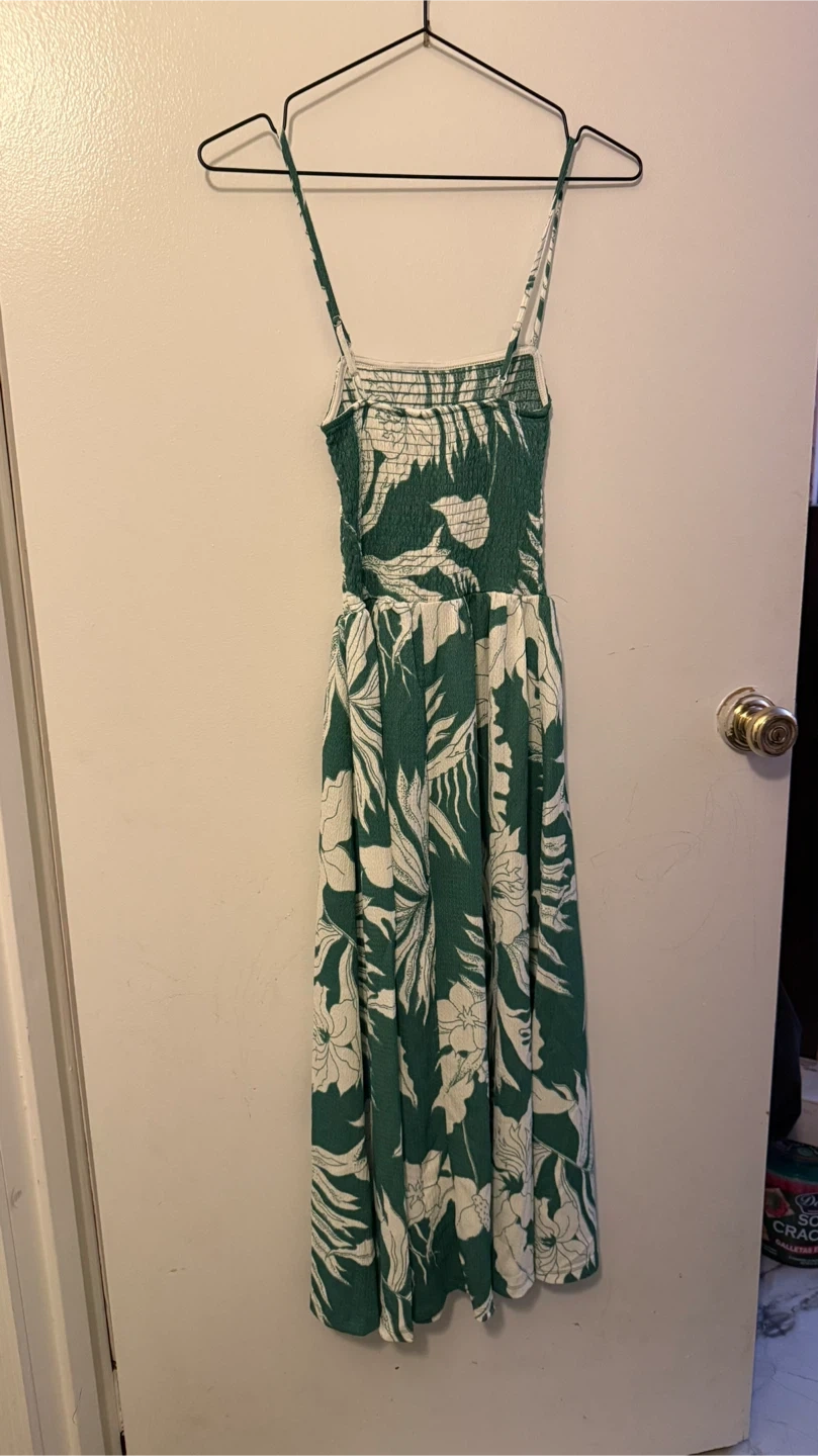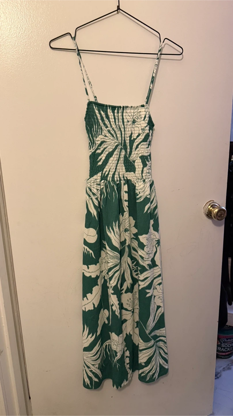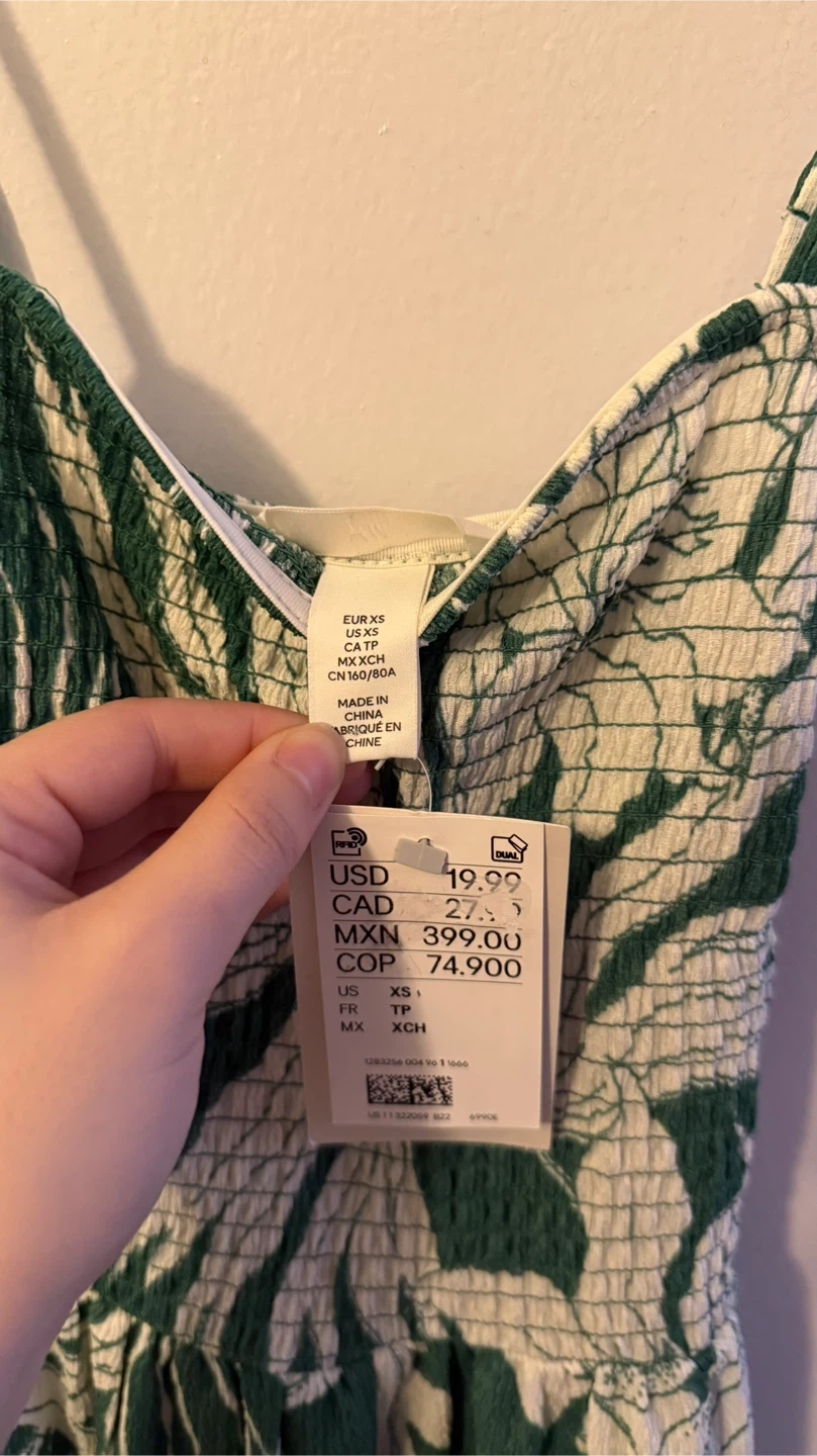 Cute H&M dress with a green and white leaf pattern! It's an XS and in great condition. The original price was $19.99 USD.