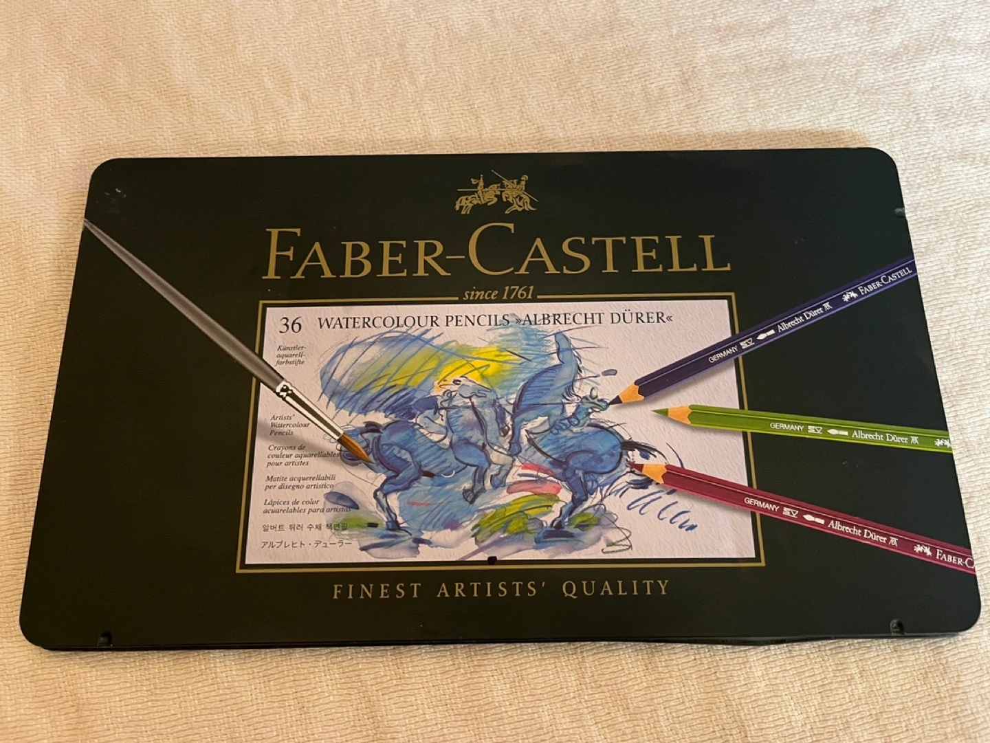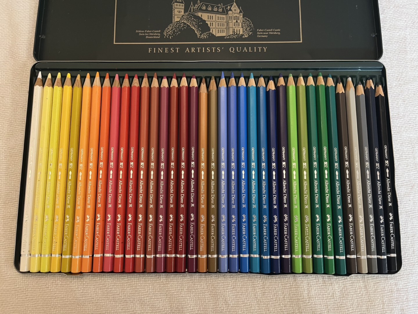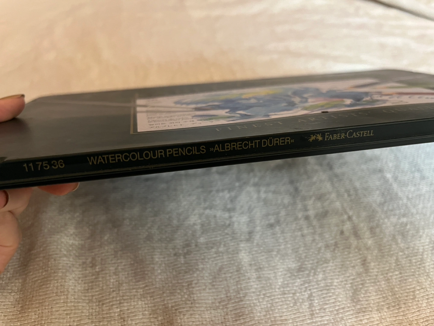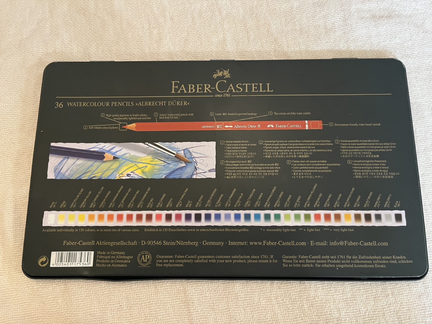 453Albrecht Dürer artists' watercolour pencils • High-quality acid-free pigments in bright colours, unsurpassed lightfastness • Soft, vibrant colour laydown • Fully water soluble lead • Thick 3.8 mm lead • High break resistance • Tin of 36 • Details https://fabercastellshopcanada.ca/products/albrecht-durer®-artists-watercolour-pencils-tin-of-36-117536 **Pickup Only @ Olive Square Park