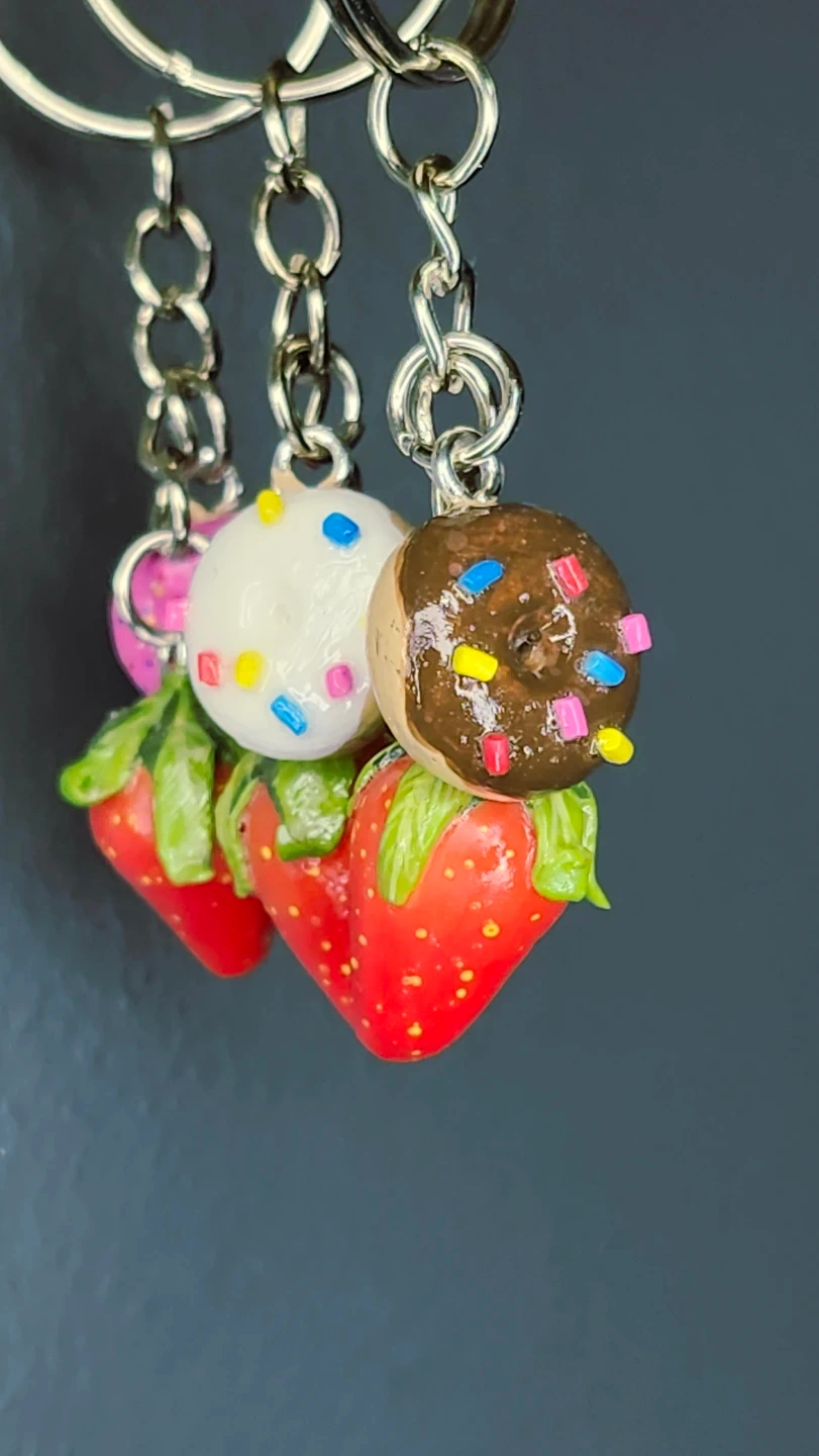 I'm selling these adorable handmade keychains! They feature a cute strawberry and donut design. Perfect for adding a sweet touch to your keys or bag!✨️💕