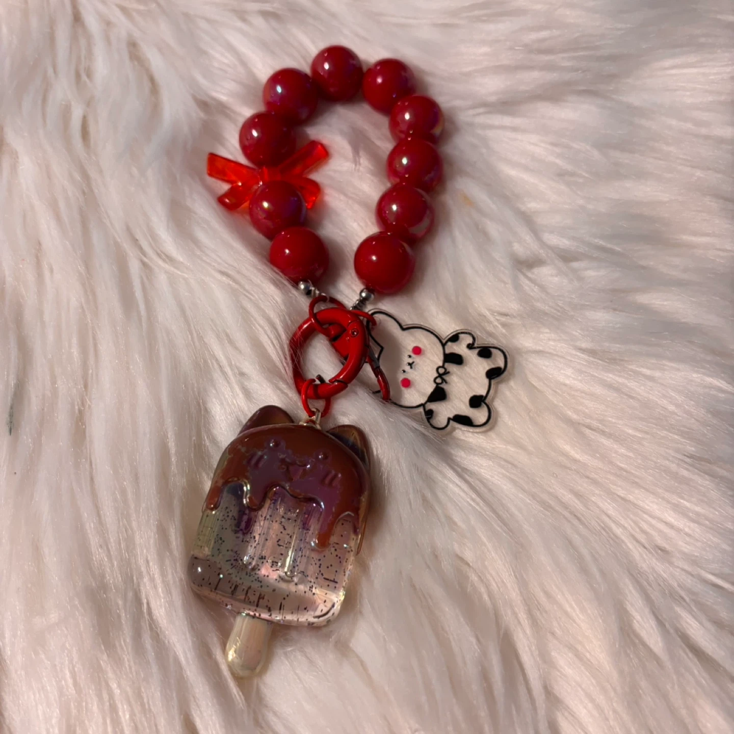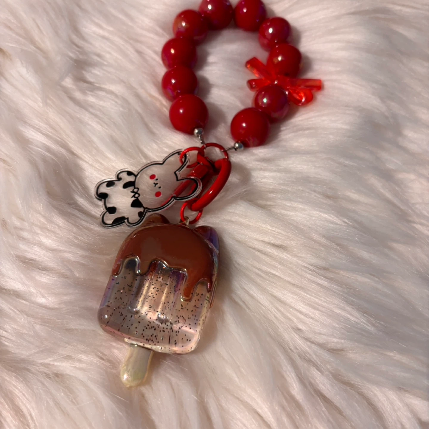 Selling a cute keychain! It features red beads and a fun ice cream charm, along with a little cow charm. It's in great condition and ready to add some flair to your keys or bag