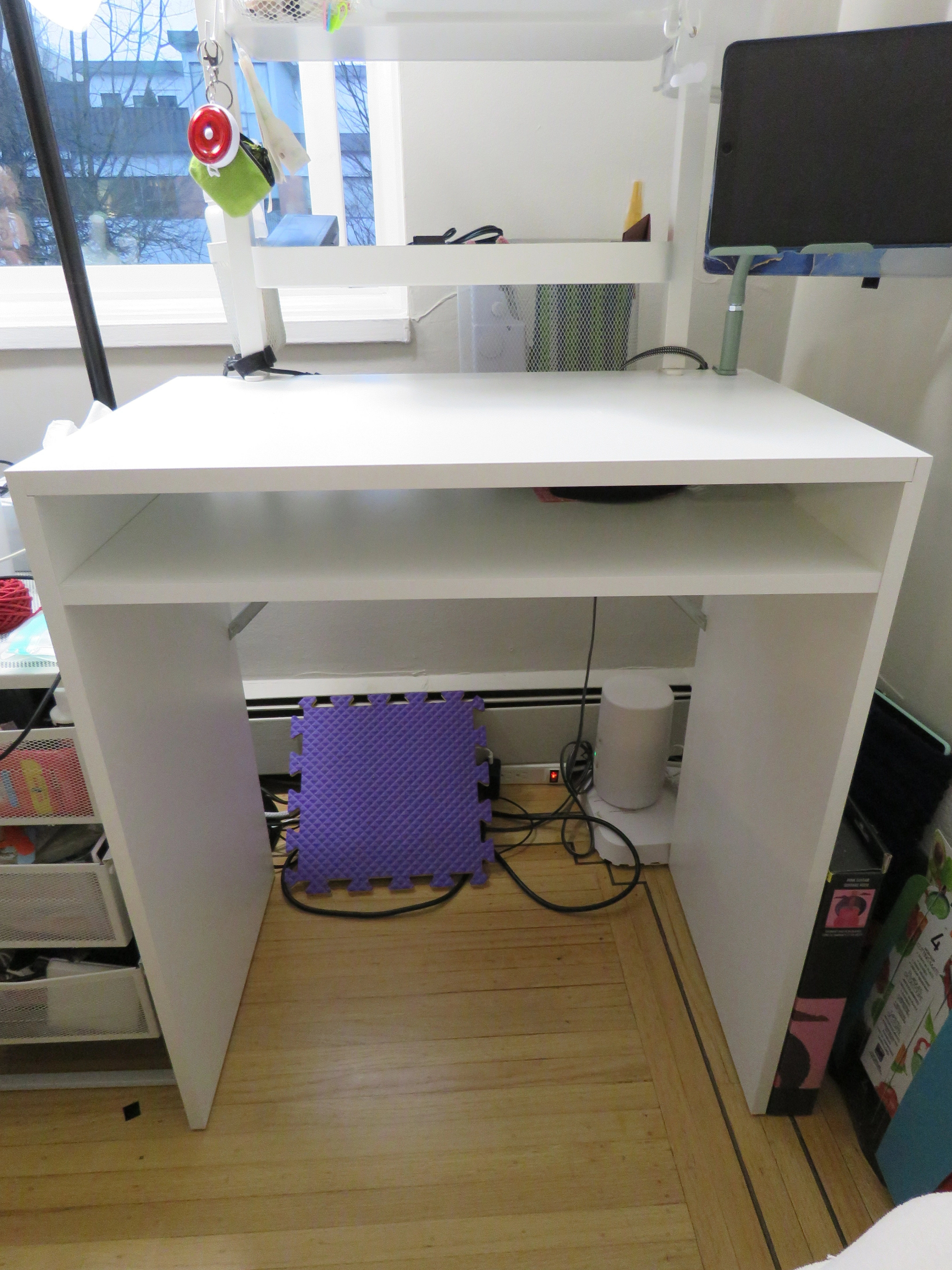 White IKEA desk in good condition. Clean, simple design with open storage space underneath. Great for home office, study desk, or student setup.