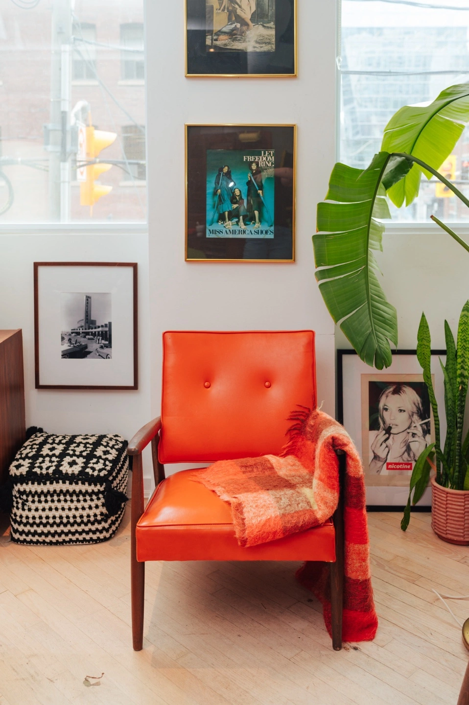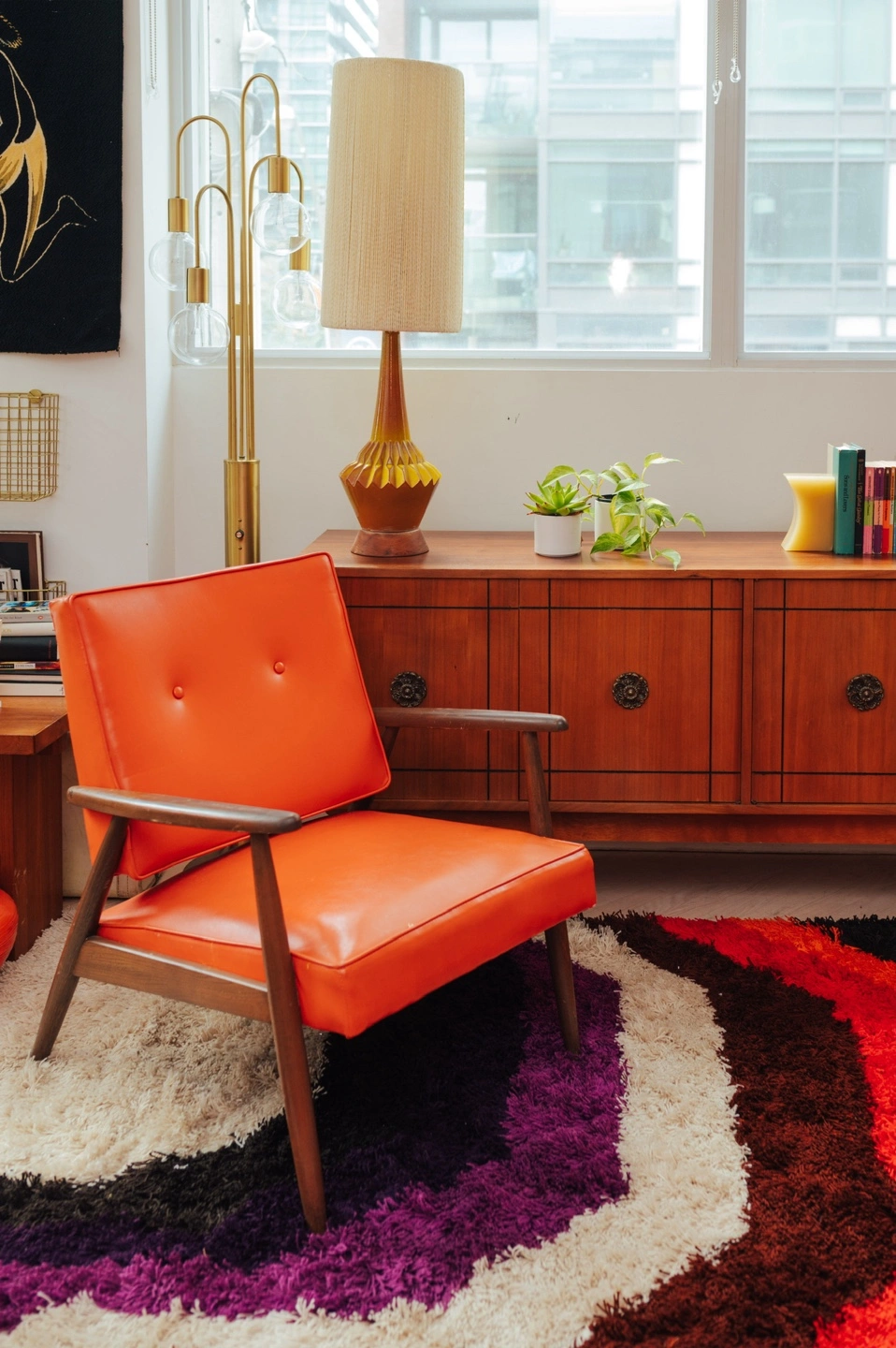 A punchy, true mid-century lounge chair with a classic low profile and sculptural wood frame. Upholstered in vibrant orange vinyl with subtle button detailing, this piece brings instant warmth and personality to any space.